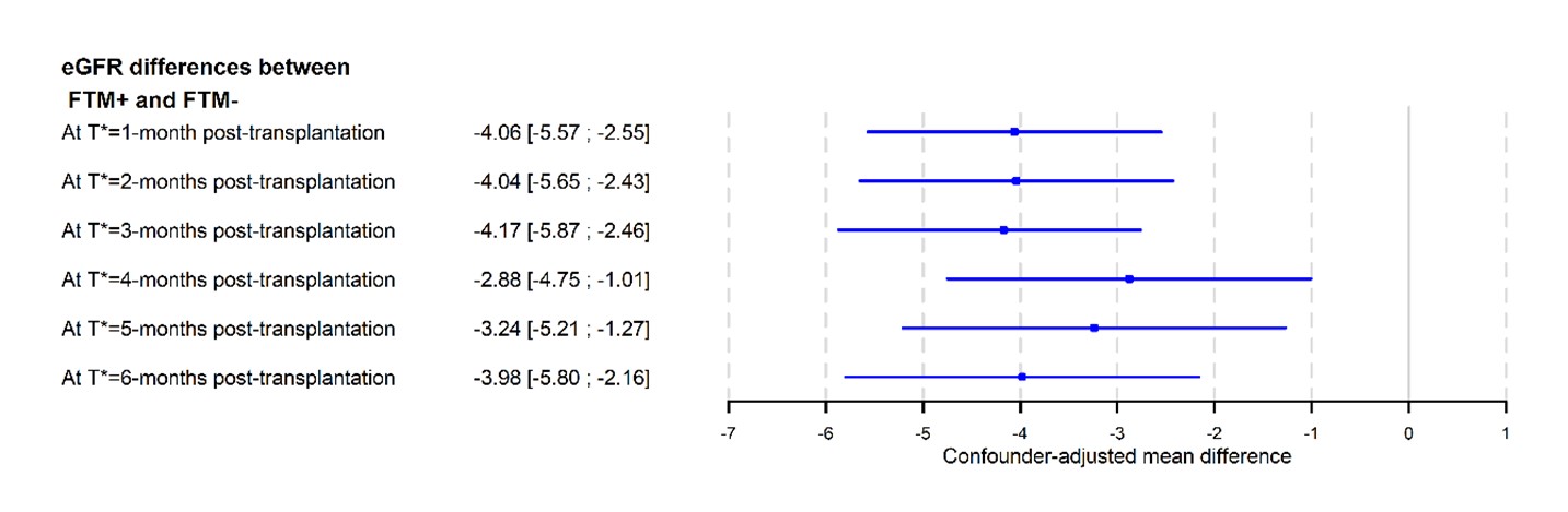 Results: 2025 patients were analyzed at T*=1-month, 45.6% were FTM+. The confounder-adjusted mean eGFR was lower for FTM+ (-4.06 ml/min, 95%CI from -5.57 to -2.55) and the increasing in eGFR level during the first six months was reduced for FTM+; meaning that being FTM+ at T*=1-month lead to a 45% reduction of allograft function improvement between one- and 6-months post-transplantation added to the baseline difference. Using later definition of the FTM+ status (T*>1-month) resulted in comparable results except that the long-term decrease of eGFR was significatively affected when defined from the fifth month post-transplantation.