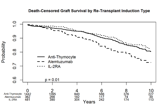 Conclusion: Compared to anti-thymocyte induction, alemtuzumab, but not IL-2RA, was associated with inferior graft survival in preemptive second transplant recipients discharged on tacrolimus and mycophenolate.