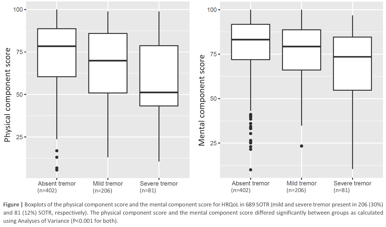 Results: We included 689 SOTR (39% female, mean [±SD] age 58 [±14] years), including kidney (n=395, 57.3%), liver (n=168, 24.4%), lung (n=95, 13.8%), and heart (n=29, 4.2%) transplant recipients at median 3 [range 1-9] years after transplantation. In total, 206 SOTR (30%) reported mild tremor and 81 (12%) reported severe tremor, with highest tremor prevalence among lung and heart transplant recipients. Multinomial logistic regression analyses showed that whole blood tacrolimus trough level was a determinant of tremor, independent of age, sex, and transplant type (OR per µg/L increase: 1.10, 95% CI: 1.00 to 1.21 for mild tremor and 1.14, 95% CI: 1.01 to 1.28 for severe tremor, P=0.045LRT ). Patients with either mild or severe tremor had significantly lower physical and mental HRQoL (P<0.001ANOVA for both, Figure). Furthermore, in linear regression analyses, severe tremor was strongly associated with lower physical and mental HRQoL (b -15.48, 95% CI: -21.07 to -9.89, p<0.001 and b -12.23, 95% CI: -17.26 to -7.19, p<0.001; resp.), independent of age, sex, type of transplantation, time after transplantation, polypharmacy, diabetes, anaemia, estimated glomerular filtration rate, use of tacrolimus, and use of cyclosporine.