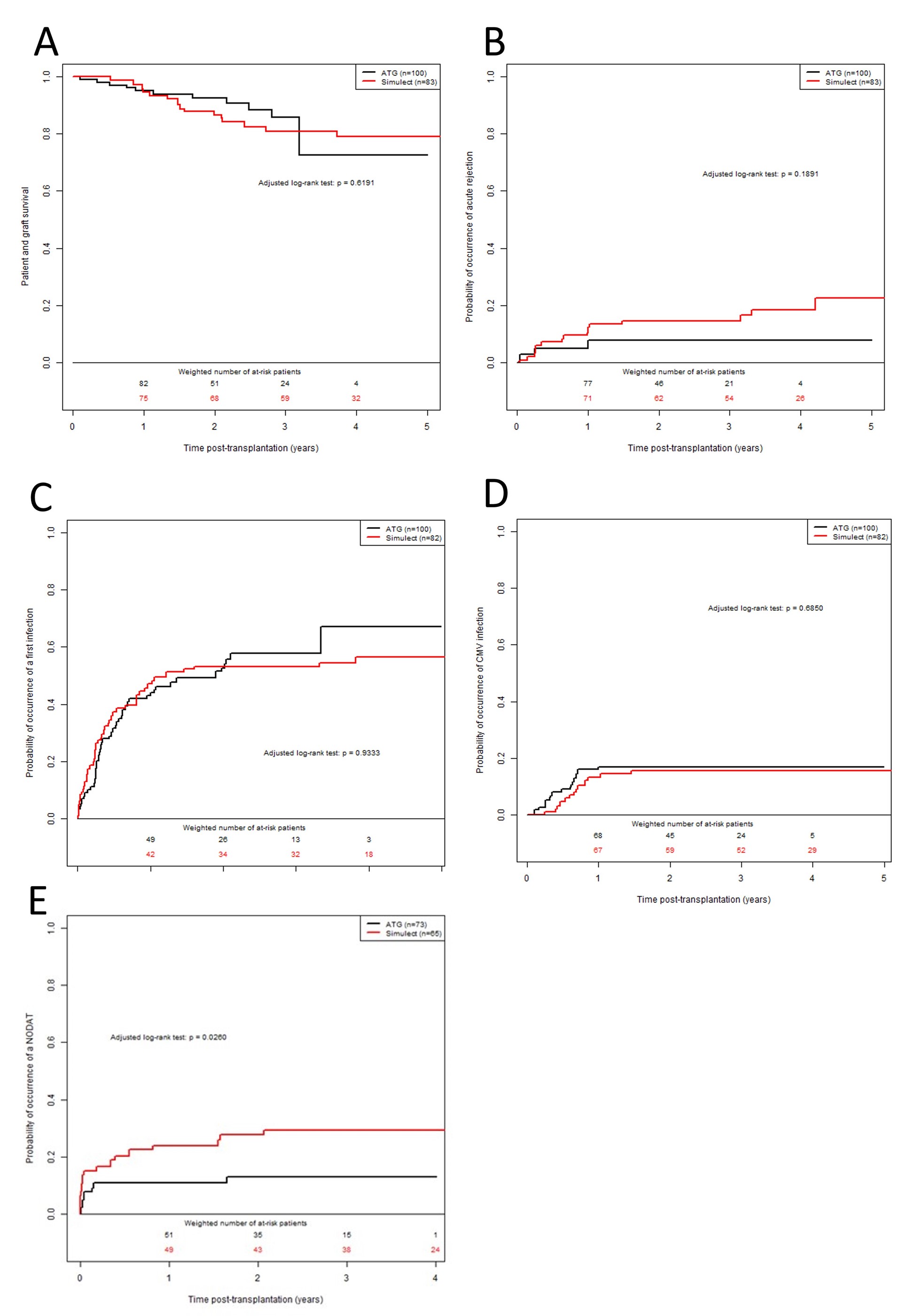 Results: 183 patients were included, 100 receiving ATG and 83 receiving BSX. Maintenance therapy was comparable between groups. Patient and graft survival did not differ between groups, as infectious and CMV episodes. There was a trend to a lower occurrence of BPAR in the ATG group (HR at 1.92; 95% CI: 0.77; 4.78, p-value = 0.1598). Occurrence of PTD was significatively higher in the BSX group (HR at 2.44; 95% CI: 1.09; 5.46; p-value = 0.0304), due to a high number of treated rejection episodes (14.5% vs 7%).