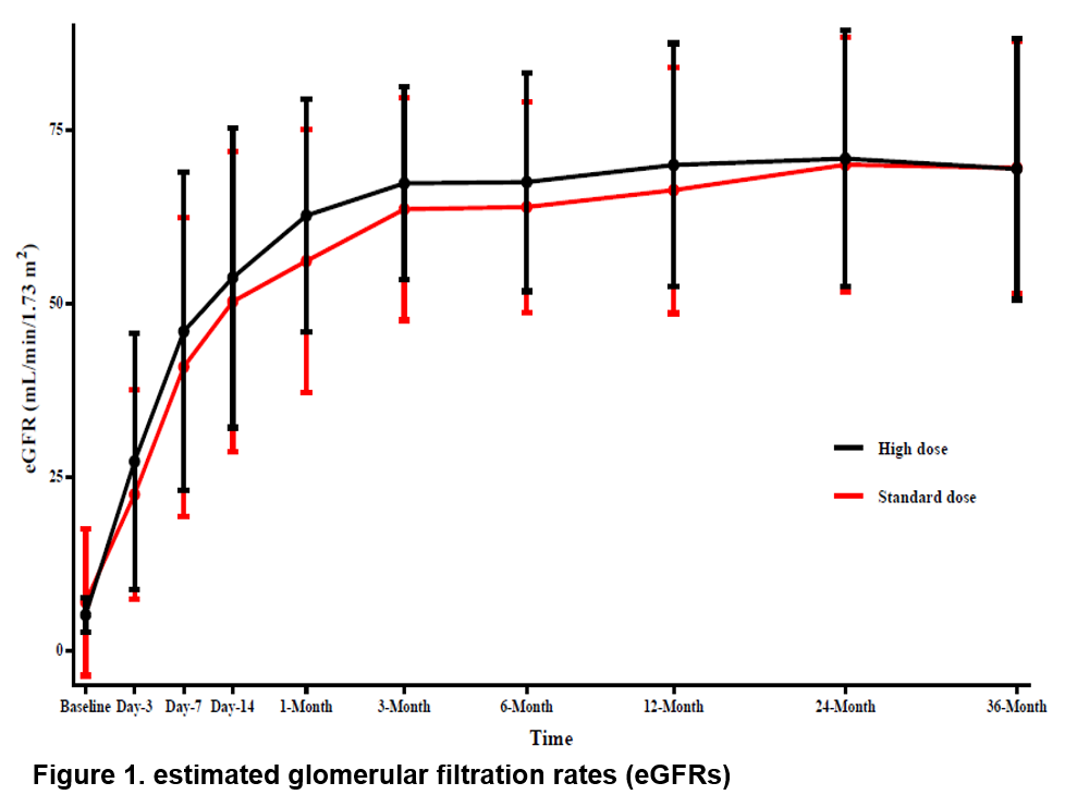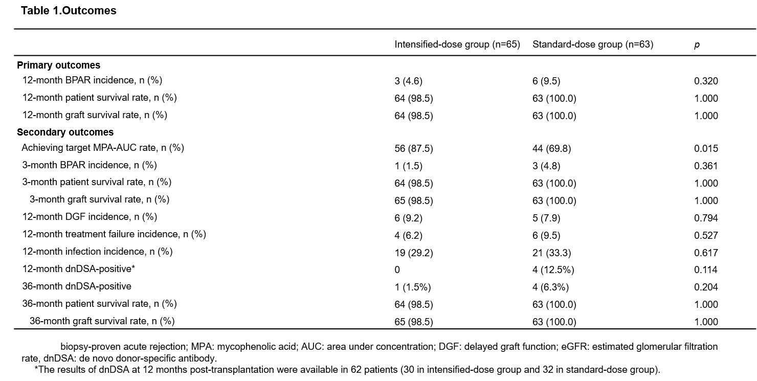 Results: A total of 128 patients were included, with 65 and 63 patients in the intensified-dose group and standard-dose group, respectively. The 12-month-BPAR incidence was numerically lower in the intensified-dose group than standard-dose group (4.6% vs. 9.5%, p=0.320). The rate of patients achieving target mycophenolic acid (MPA)-area under the concentration (AUC) was significantly higher in the intensified-dose group (87.5% vs. 69.8%, p=0.015) (Table 1) than standard-dose group, and patients achieving target MPA-AUC had a significantly lower 3-month-BPAR incidence (1.0% vs. 11.1%, p=0.03) (Table 2). patient and graft survival rates at 36 months between the intensified-dose and standard-dose groups was 98.5% vs. 100.0% and 98.5% vs. 100.0%, respectively. The 36-month- de novo donor-specific antibody (dnDSA) positive incidence rates was numerically lower in the intensified-dose group than standard-dose group (1.5% vs. 6.3%, p=0.204). In addition, delayed graft function, treatment failure, serum creatine levels, eGFRs and infection incidence had no significant differences between the two groups (all p>0.05) (Figure 1). The incidence rates of infection were similar in both groups (29.2% vs. 33.3%, p=0.617). No additional safety concerns related to intensified dosing of EC-MPS.