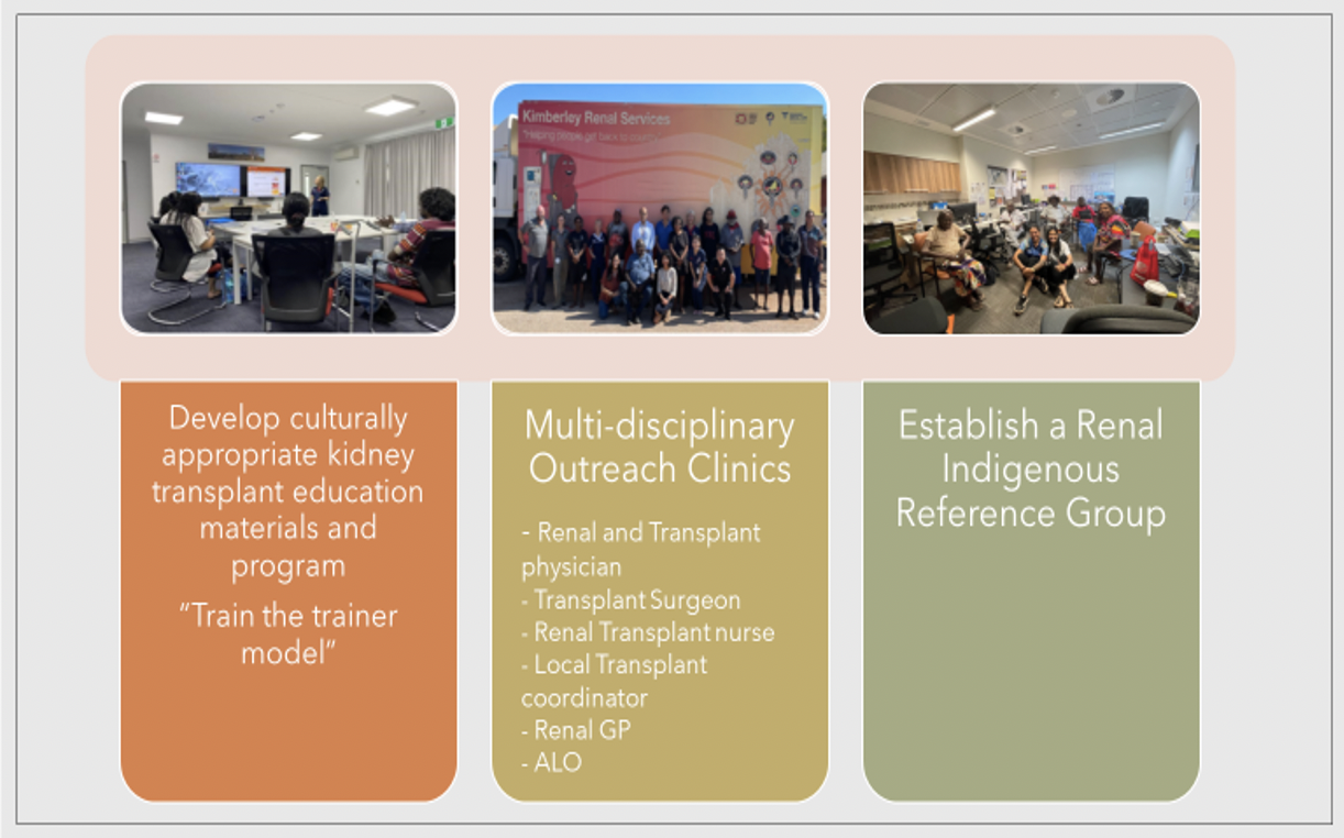 Results: A multi-pronged approach was used. Culturally appropriate KTx education modules were developed for patients and health professionals in close consultation with Aboriginal liaison officers, Aboriginal health service and the members of the newly established Indigenous Reference Groups (IRG) from the region. These materials were utilised during the small group formal education and informal yarning sessions during the Transplant Outreach Clinics. Work is ongoing to create flip-books and posters. Indigenous Reference Groups were formed across the Kimberley region. Three multi-disciplinary Outreach Clinics were conducted in the region, attended by transplant physicians, surgeons and nurses. This resulted in an increase in the number of Aboriginal patients undergoing assessment from 10 to 71, with 23 being approved for transplant suitability. Several patients were identified to have modifiable barriers to transplant work-up. The number of patients active on the transplant waitlist increased from 4 to 12 within a year of outreach visits. To date, 6 patients from the region have successfully received a transplant. Feedback from patients has been overwhelmingly positive.