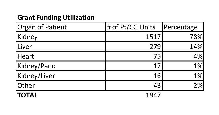 Of the 1,947 Pt/CGs receiving funds, 1,517 were to kidney Pt/CGs(78%), 279 were for liver Pt/CGs(14%), and 75 were for heart Pt/CGs(4%).