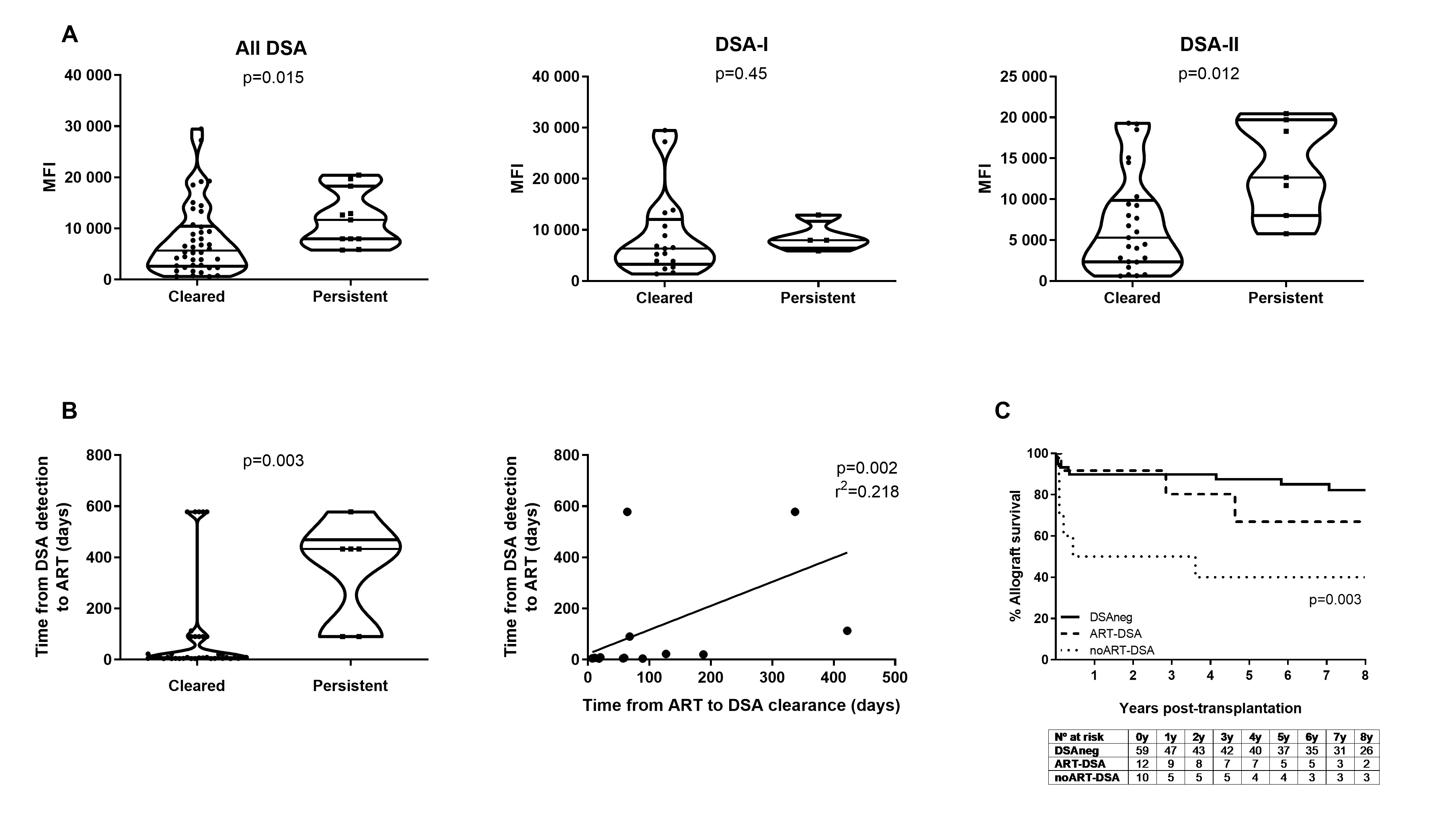 Considering as successful outcomes both the complete DSA removal and the partial decrease (in number of specificities and/or DSA intensity), ART resulted effective in the 79% of the procedures (11/14), 83% of transplants (10/12) and 90% of recipients (9/10). Regarding the indication, ART showed a 100% effectiveness in patients treated for dnDSA without clinical symptoms, whereas it decreased to 67% for preformed DSA and DSA in the context of rejection (needing in some cases more than one procedure to achieve the complete clearance). Analyzing the impact of DSA MFI on the ART outcome, we observed that it was significantly higher in persistent than in cleared DSA (p=0.015) (Figure 1A). This difference was mainly attributed to DSA-II, in which MFI values showed to be much more decisive for DSA removal (p=0.012). Another factor relevant for the therapy success was the time between DSA detection and ART starting, this being significantly lower for cleared DSA (p=0.003) (Figure 1B). The 8-year allograft survival in treated recipients was similar to those without DSA. Nevertheless, non-treated patients with DSA showed a significantly lower graft survival (p=0.003) (Figure 1C).