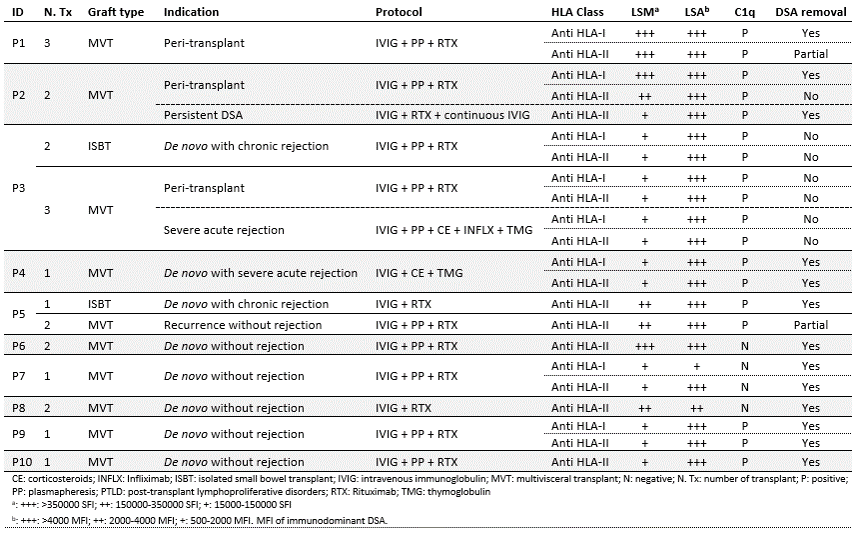 Introduction: Donor specific anti-HLA antibodies (DSA) impact negatively on the outcome of intestinal grafts. Although the use of antibody-removal therapies (ART) is becoming more frequent in the last years, issues regarding their timing and effectiveness remain under discussion, especially when they are detected in the absence of any clinical symptom.