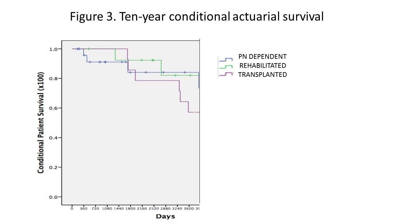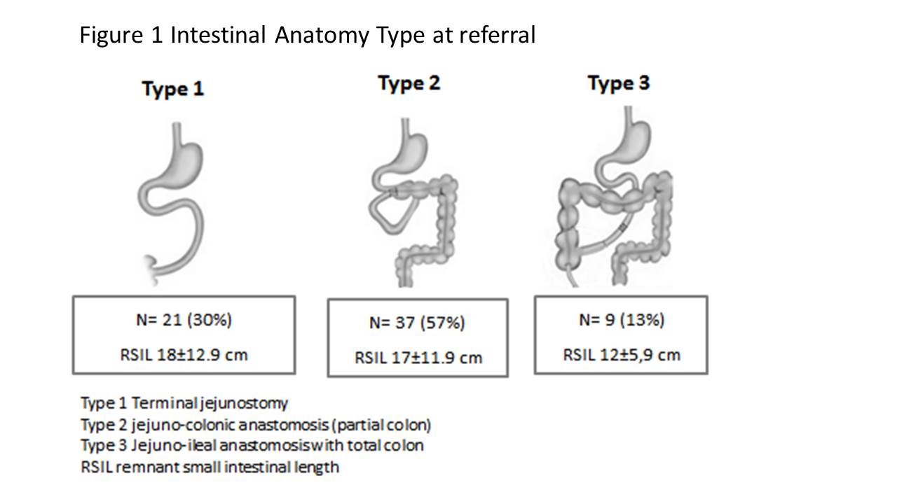 Results: 67 patients were included; 46 (69%) male, 25 (37%) premature (mean gestational age 33.5 weeks), 55 (82%) had neonatal onset of IF. Etiologies were: gastroschisis (31%), intestinal atresia (22%), volvulus (19%), long segment Hirschsprung's disease (7.5%), NEC (6.5%); post-surgical complications (5%) and others (9%). Median RSIL at the time of resection was 16.7±11.7 cm; intestinal anatomy type is shown in figure 1. Mean age at first consult was 2.93±3.51 years. At referral, mean time of PN dependency was 623±890 days, mean PN support 113% of the estimated basal metabolic rate for age. Fourteen (21%) had extensive central venous thrombosis and 16 (24%) had advanced fibrosis on liver biopsy. At the cut off day of analysis, 14 (21%) achieved intestinal rehabilitation, and 9 (13%) had at least 20% reduction of PN support. Twelve (32%) of those that remained PN dependent were included on the waiting list at referral and died shortly after thus are considered late referral. Fifteen (22.5%) underwent Intestinal transplantation (ITX) 14 Isolated, 1 MTV (figure 2). Ten-year conditional actuarial survival of the series was 72% (figure 3)(84% for PN dependent, 82% for rehabilitated patients and 57% for ITX recipients).