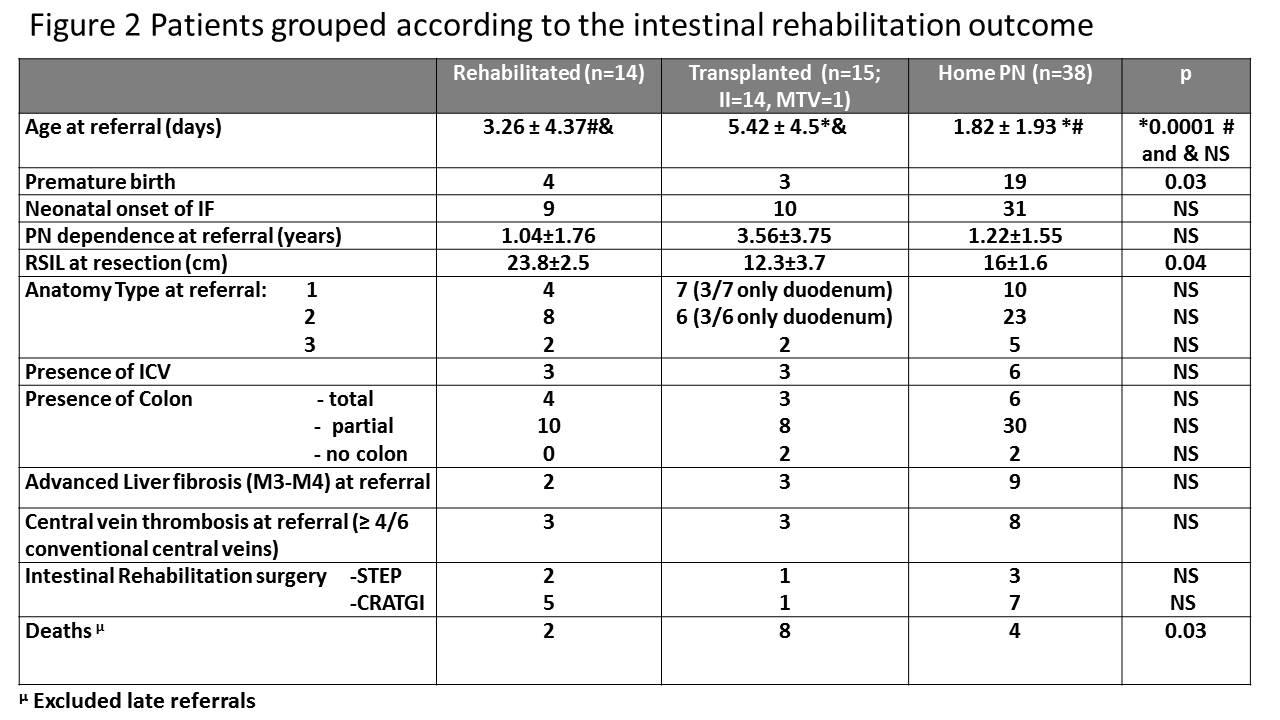 Material and methods: Retrospective review of a prospectively filled database of pediatric patients with chronic IF secondary to SBS (≤ 40 cm of remnant small intestinal length- RSIL) seen from May 2006 to December 2021. Patients were grouped according to the intestinal rehabilitation outcome; for survival analyses, late referrals were excluded. Data was analyzed using SPSS,v20.0.