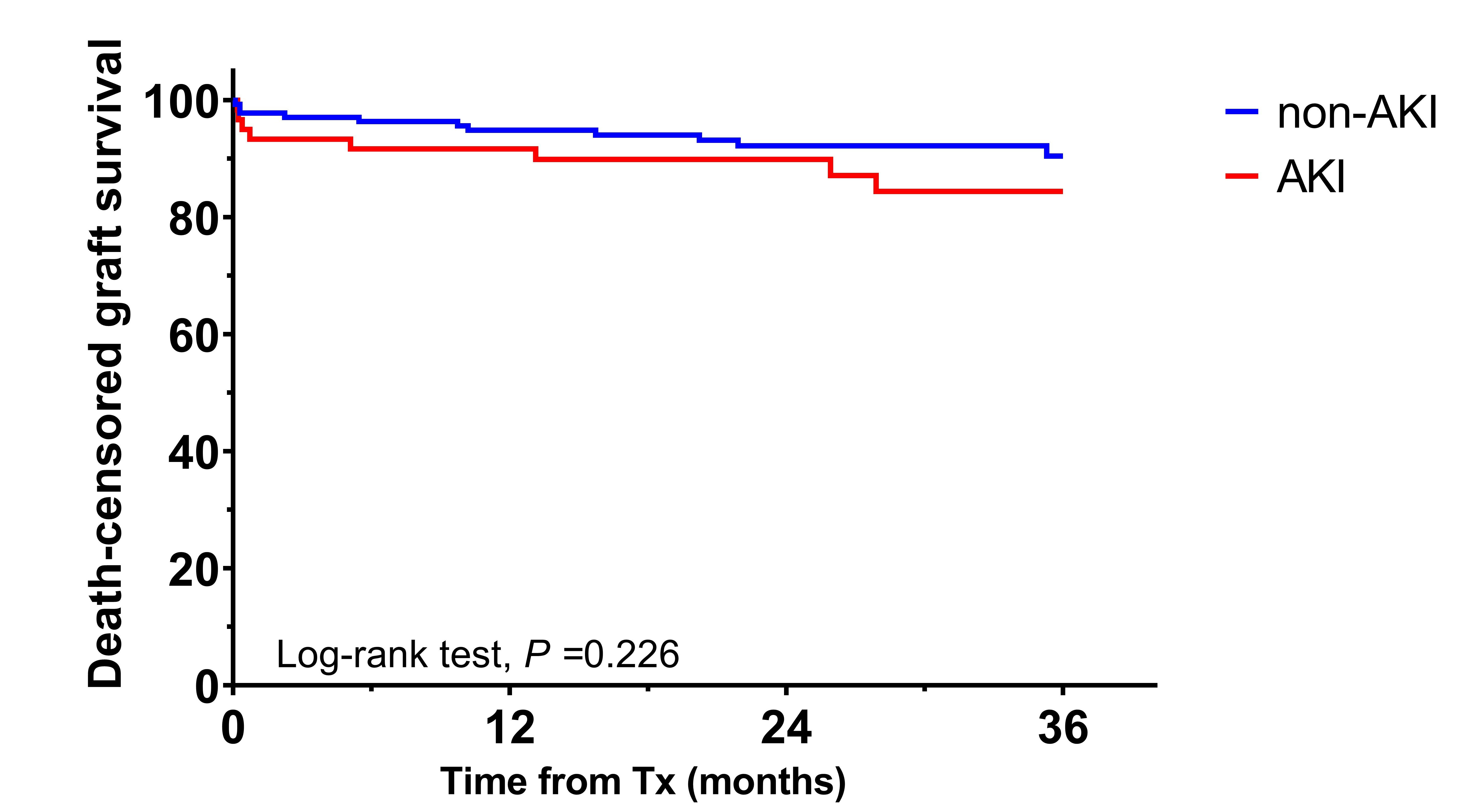 Results: Of all 197 enrolled patients, 60 (30.46%) were transplanted from AKI donors and 137 (69.54%) from non-AKI donors. Patients were followed for a median of 31 months (range, 12-108 months) after transplantation, during which 24 (12.18%) grafts were lost, and 2 (1.02%) patients died of pulmonary infection. Rejection (50%) was the leading cause of graft loss followed by vascular thrombosis (20.83%) and recurrent disease (12.5%). No significant difference was found between the two groups on the incidence of acute rejection over time (P = 0.1597). Primary nonfunction was observed only in one patient from the AKI group. Delayed graft function occurred equally between two groups (16.67% vs. 13.87%, P = 0.61). All groups demonstrated satisfactory graft function, eGFR at 3 years post-transplant was 84.6±22.63, 91.03±33.25mL/min/1.73m2 for AKI and non-AKI groups, respectively (P = 0.441). Three-year death-censored graft survival in the AKI group was 83.33%, comparable to the results in the non-AKI group (89.78%, P = 0.226). The adjusted hazard ratio (aHR) for graft loss was similar for recipients of AKI (aHR 1.48, 95% CI 0.65-3.35, P = 0.348) compared with the non-AKI group.