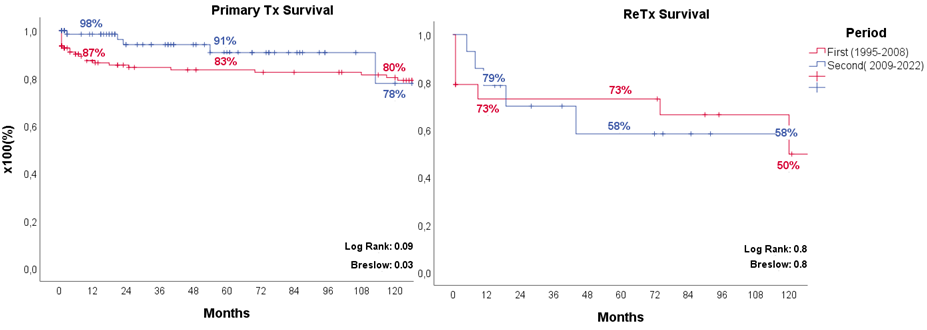 Material and methods: Retrospective analysis of patients <18 years old who underwent primary Tx or re-transplant (reTx) of the liver between January 1995 and December 2021 at a single center. Demographic data, time on the waiting list, indication and type of Tx, length of hospital stay, ischemia times, complications, overall graft and patient survivals were analyzed. Survival analysis was also performed comparing 2 different groups, G1: 1995-2008 and G2: 2009-2022. Statistical analysis was performed with SPSS version 25.0.