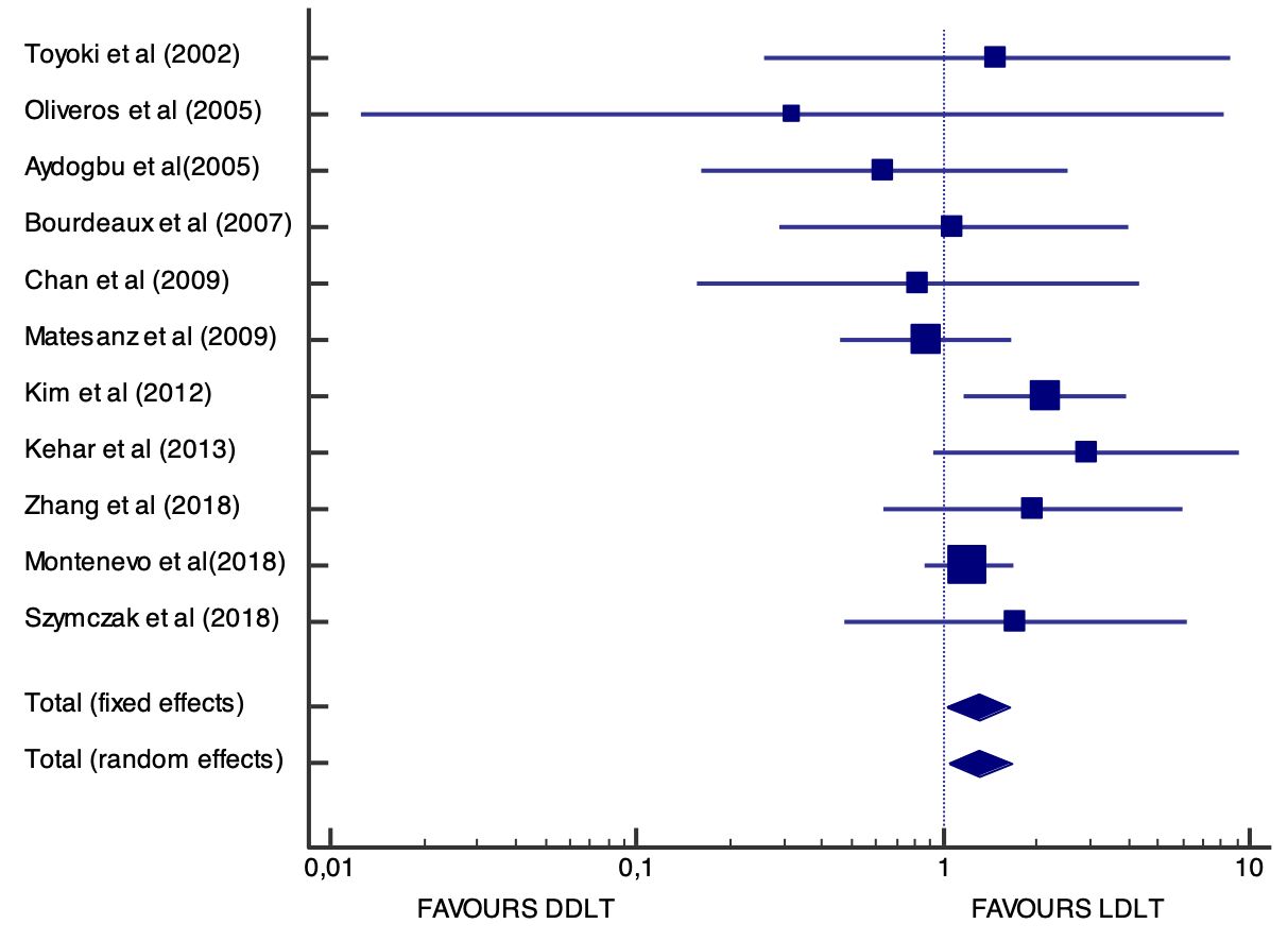 Materials and methods: The chosen study search formula was used on PubMed and Google Scholar. Cohort or case-control studies that reported one-year survival for both LDLT and DDLT were included. The year of publication was not an exclusion criterion. For the statistical analysis, the MedCalc 19 program was used, where the Forest Plot graphs were also made, as well as a Funnel plot for detecting heterogeneity.