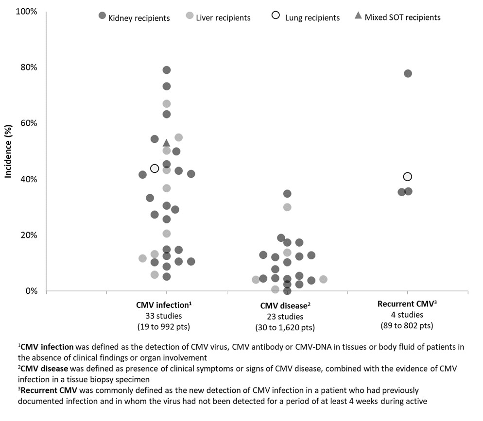 Conclusion: Heterogeneity in the incidence of CMV infection across organ types and countries outside of North America and Europe was found, despite most studies reporting on adult kidney recipients. High rates of CMV infection, CMV recurrence and CMV disease are likely to impact graft and patient outcomes post-transplantation and may contribute to greater disease burden post-SOT.