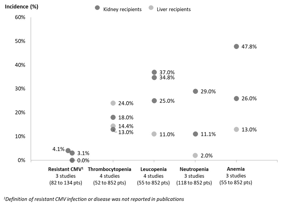 Conclusion: The conventional 1L treatment for both prevention and treatment of CMV was IV GCV or VGCV. However, as identified studies reported that 1 in 4 pts experience hematological AEs with these therapies, there remains an unmet need for this patient population. Data on the proportion and management of SOT pts with resistant and/or refractory CMV remains scarce in countries outside of Europe and North America.