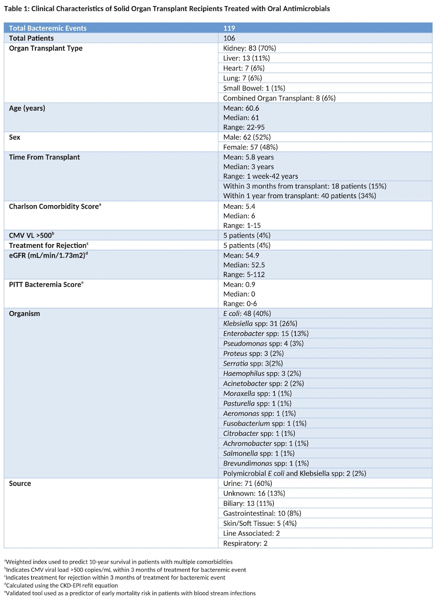 Methods: We performed a retrospective observational study and identified all SOTR with GNBI within the Massachusetts General and Brigham and Women’s Hospital systems from 2016-2021. We then identified patients who were transitioned from intravenous to oral agents to complete their treatment. To be considered eligible for analysis, patients had to have adequate source control and could not have evidence of a complicated infection (e.g endocarditis, osteomyelitis, undrained abscess) that would inherently require a prolonged treatment course. We recorded patient demographics, type of and time from transplant, comorbidities and Charlson comorbidity score, PITT bacteremia score, immunosuppressive regimen, and eGFR at time of transition to an oral agent. We noted the source of infection, infecting organism, antimicrobial agents used and duration of oral and IV therapy. Primary endpoints were mortality, recurrence of bacteremia and re-initiation of IV antibiotics for the same underlying infectious process within 30 days of treatment completion. Secondary endpoints included length of stay, development of C difficile infection, treatment associated complications, and need for further oral antibiotics directed at the initial infectious process. We are collecting further data on a control population.