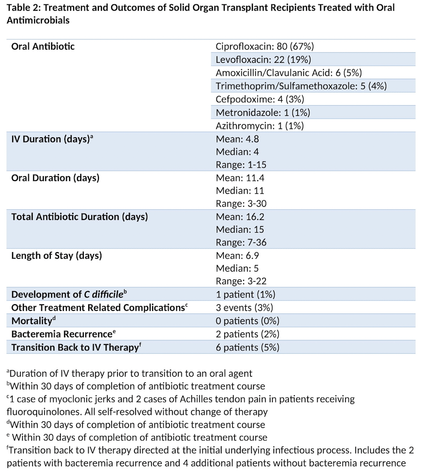 Conclusions: Conversion from IV to oral therapy with highly bioavailable antimicrobials is safe and effective for treatment of GNBI in SOTR. Randomized controlled trials are needed to confirm these findings.
