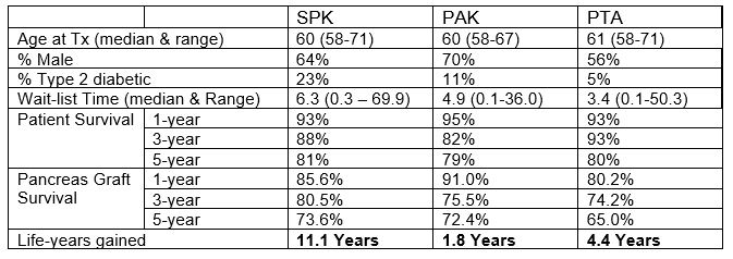 Methods: Between 2000 and 2017, 885 diabetic patients 58 years of age or older were listed for a primary deceased donor pancreas transplants in the USA. 75% of patients were listed for a simultaneous pancreas kidney transplant (SPK), 12% previous kidney for a pancreas after kidney (PAK) and 12% for a pancreas transplant alone (PTA). Uni- and multivariate statistical methods were used to assess wait-list mortality, outcomes and life-years gained for older pancreas transplant recipients. Each patient had a potential follow-up of at least 4 years post-transplant.