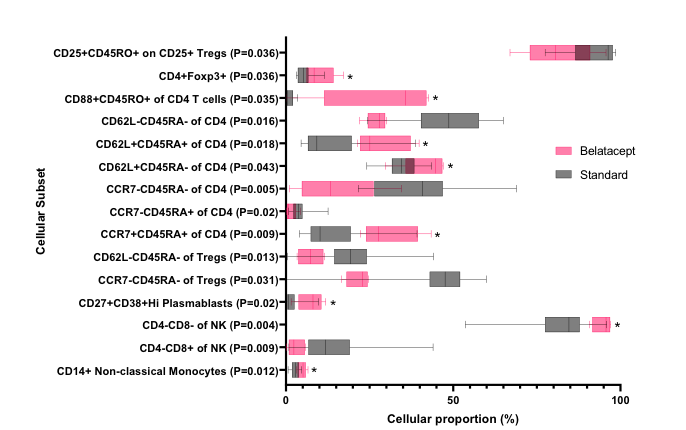 Results: Overall there was a significant decrease in CD3+T-cell count (p=0.007) at 12-months post-thymoglobulin induction. Eighteen cell proportions differed significantly between drug groups (Fig. 1). Absolute mean CD4:CD8 ratio was reduced in both groups and lower at all post-transplantation Belatacept timepoints. However, the CD4+Foxp3+T-regs (p=0.036) proportion was higher in the Belatacept group at 12-months, suggesting the agent spares this subset while deleting effectors. This effect was especially noticeable at 3-months where the absolute CD4+FOXP3+T-reg count was higher in the Belatacept group. Central-memory CD62L+CD45RA- and CD62L+CD45RA+ CD4+T-cells were increased, while CD62L-CD45RA-CD4+T-cells decreased, suggesting an upregulated central-memory response. This was consistent with an increased proportion of CCR7+ compared to CCR7- CD45RA+CD4+T-cells and an increased proportion of CCR7+central-memory CD25+Foxp3+T-regs.