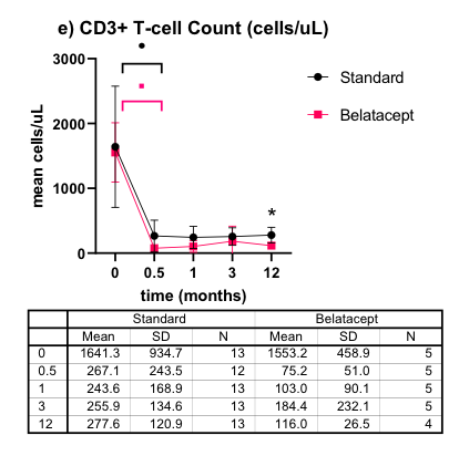Methods: Of 18 islet-transplant recipients, 5 were treated with Belatacept and sirolimus maintenance immunosuppression. Whole blood flow-cytometric immunophenotyping was performed using 45 cell markers at pre-transplantation (0-months), then 0.5-, 1-, 3- and 12-months post-transplantation. Mean cell proportions between drug groups were compared at each timepoint using Mann-Whitney U test, and against adult controls at 0-months. Non-parametric and regression analysis will be performed at 12-months comparing cell proportions against graft function according to the Igl’s criteria.