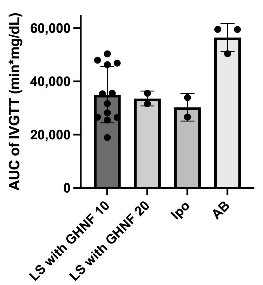 . Notably, unlike keratinocyte sheets, adhesion between the diaphragm and liver appeared to be minimal in the LS with GHNF 20 group, suggesting that additional Tx may be feasible. However, when the dose of islets was reduced, the cure rate of LS with GHNF 10 was proportionately decreased (23.8%). The glucose tolerance was significantly better in the Ipo, LS with GHNF 20, and LS with GHNF 10 groups than in the AB group (area under the curve: 30,268±5,183, 33,578±2,783, 34,974±10,545 vs. 56,483±5,263 min·mg/dL, respectively; p<0.01) (Fig 2)