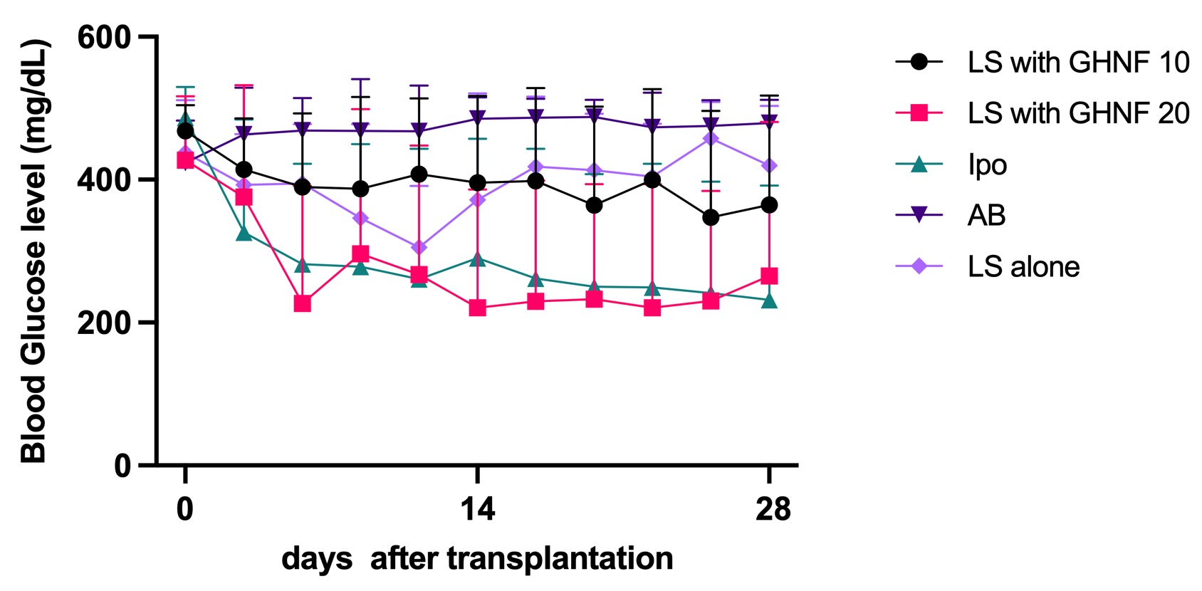 Results: No diabetic recipients were cured in the AB or LS alone groups (Fig 1). In contrast, in the Ipo and LS with GHNF 20 groups, blood glucose levels decreased promptly after Tx, and the cure rate of diabetic recipients was comparable between the groups (62.5% vs. 66.7%) (Fig 1)