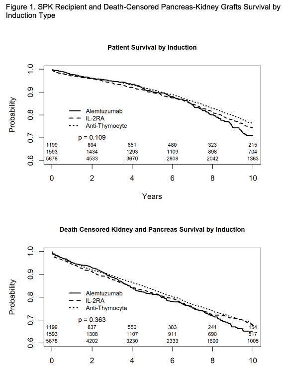 Conclusion: r-ATG use was associated with the lowest kidney and pancreas rejection rates. Compared to r-ATG, alemtuzumab but not IL-2RA was associated with worse long-term death-censored SPK grafts outcome. Our analysis supports the US national popularity of r-ATG induction in primary SPK recipients.