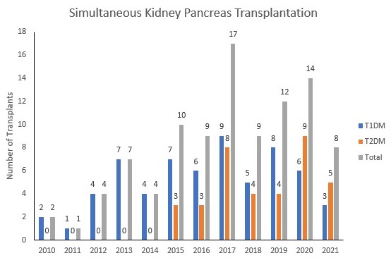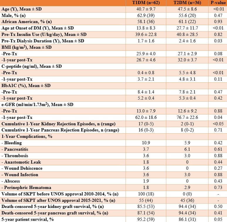 Method: From Feb 2010 to Dec 2021, 62 T1DM and 36 T2DM SKPT recipients were studied. BMI, c-peptide, HbA1c, and e-GFR were evaluated pre-transplant and post-transplant until 1-year. Outcomes included volume of SKPT pre-and post- UNOS approval of SKPT for T2DM, complications, death-censored 5-year kidney and pancreas graft survival, and 5-year patient survival.