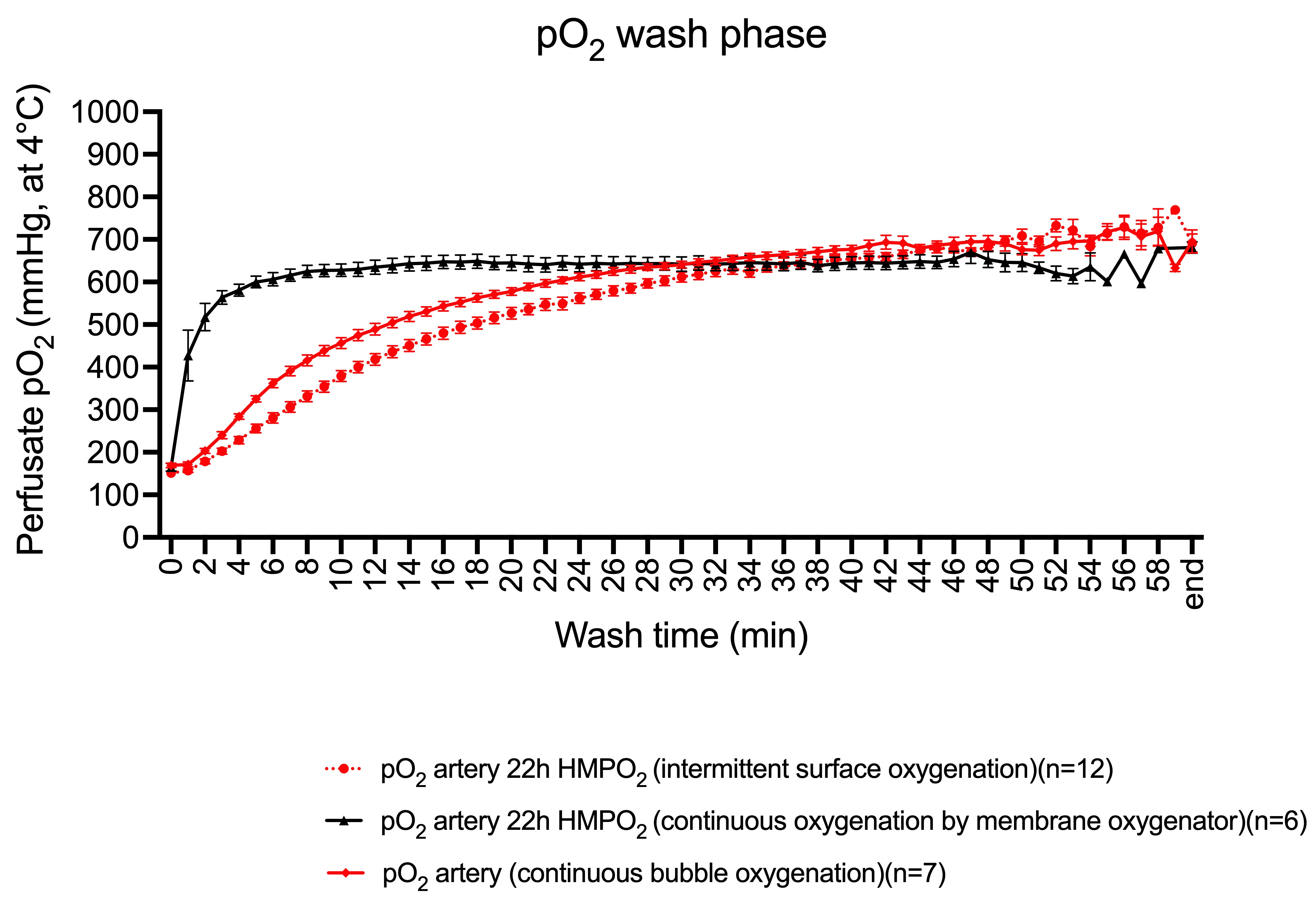 Results: O2 uploading of the perfusion fluid by minimum 15 minutes of direct bubble oxygenation was as efficient as membrane oxygenation to achieve pO2 levels above 450-500 mmHg (at 4°C) before connecting the kidney to the perfusion device (Figure 1).