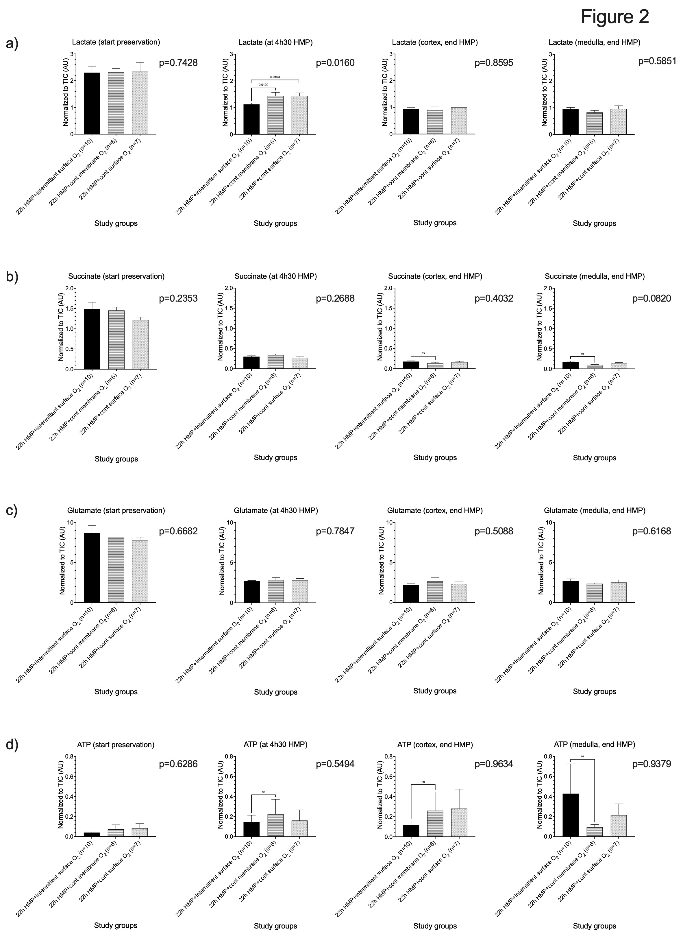 Metabolic analysis (i.e. lactate, succinate, glutamate, ATP, ADP, AMP, NADH, NAD+ and Flavin Mononucleotide (FMN)) on end-preservation cortical and medullar tissue biopsies demonstrated a similar mitochondrial protection/preservation in all study groups (Figure 2). FMN measurement by fluorescence demonstrated no difference between all study groups during the first 270 minutes of preservation, however perfusate FMN levels were significantly higher at the end of the preservation period in the membrane-oxygenated groups as compared by both surface-oxygenated HMP groups.