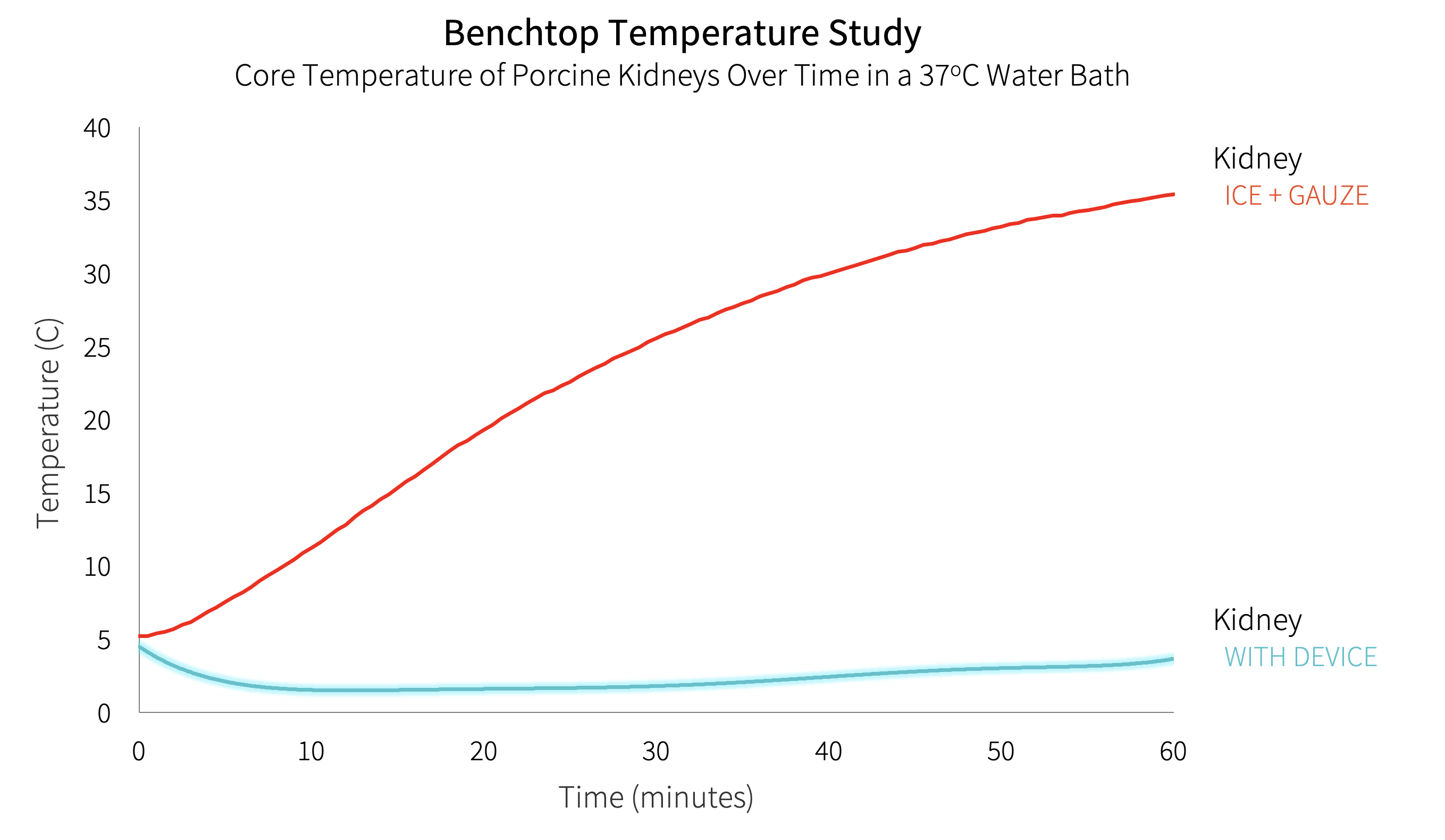 Method: The objective biodesign process was used to identify this clinical need through observation, develop a needs statement, and filter the need against others. A needs-specification document was developed outlining stakeholder value propositions, health-economic value, and existing intellectual property. ASTS surgeons (n=185) and organ-preservation specialists were surveyed to develop the needs-criteria for a device. The invention step resulted in several embodiments that addressed the clinical need, population, and outcome outlined in our needs statement. Following objective concept selection, a prototype device applied to the kidney immediately prior to anastomosis was built using stretchable hydrogel and phase-change gel. Adult porcine kidneys were used to test the device in a validated retroperitoneal-model placed within a water bath at 37oC (98.6oF). Core temperatures were monitored using implanted probes at 30 second intervals. Time to reach the maximum ischemic threshold of necrosis (15oC, 59oF) was compared to an ice + gauze control.