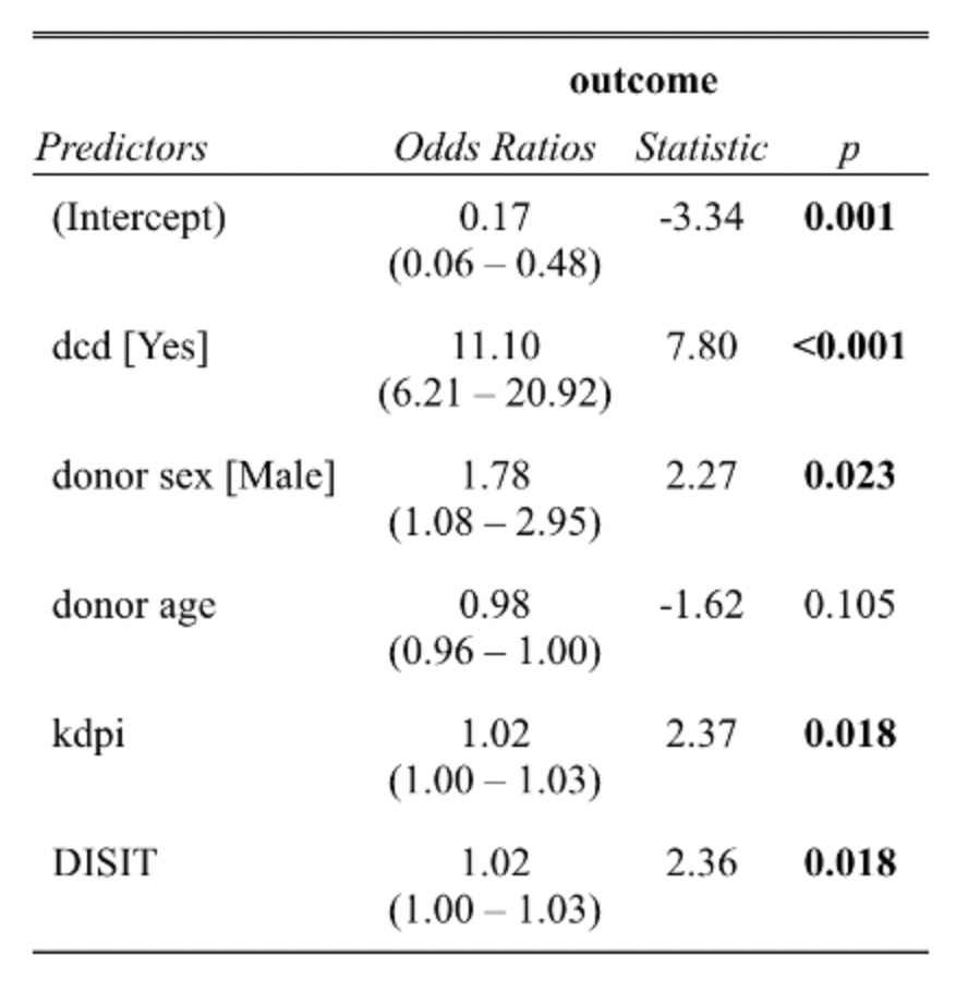Methods: Using data from 540 consecutive kidney transplants between 1st of January 2014 and 1st of January 2022, we assessed the association between DISIT and graft function post-transplant using a multivariable ordinal logistic regression, adjusted for DCD status, donor sex and age, and KDPI. We defined graft function as immediate, slow graft and delayed graft function. In a subset of our cohort, n = 47, histological assessment (cv score – Banff criteria for chronic vasculitis) of the allograft was assessed using a linear regression.
