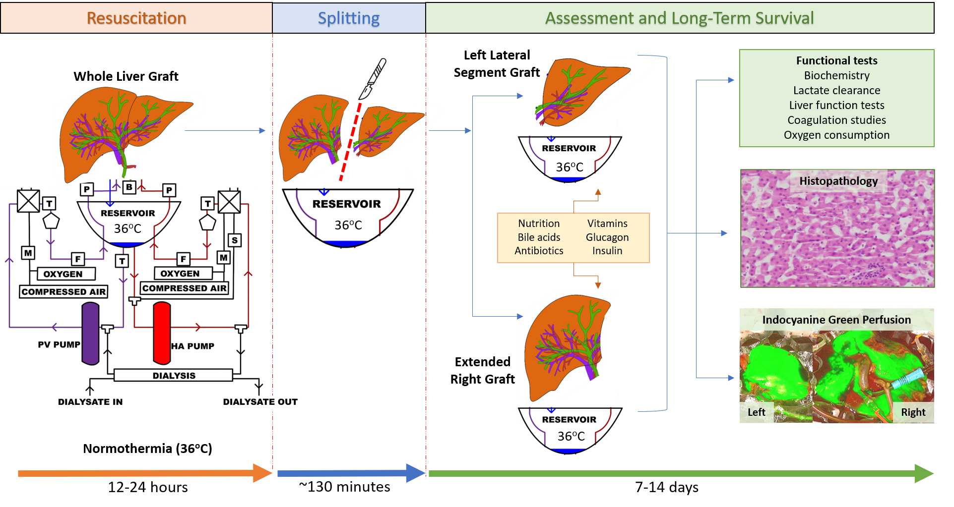 Method: We developed a protocol for long-term organ perfusion using a modified commercial system which included long-term oxygenators, a gas-mixer and a dialysis filter. Human livers not suitable for transplantation were perfused using a human red-cell based perfusate under normothermic conditions (36°C) and then surgically split without interruption to perfusion. The resulting left lateral segment grafts and extended right grafts were then perfused on separate machines for the purpose of long-term survival and individual graft assessment with biochemical and histological markers of liver function (Figure 1). Novel methods for understanding the cause of graft failure of these human livers in the long-term were used including indocyanine green perfusion, microbial cultures, lipidomics, metabolomics and assessment of pro-inflammatory cytokines.