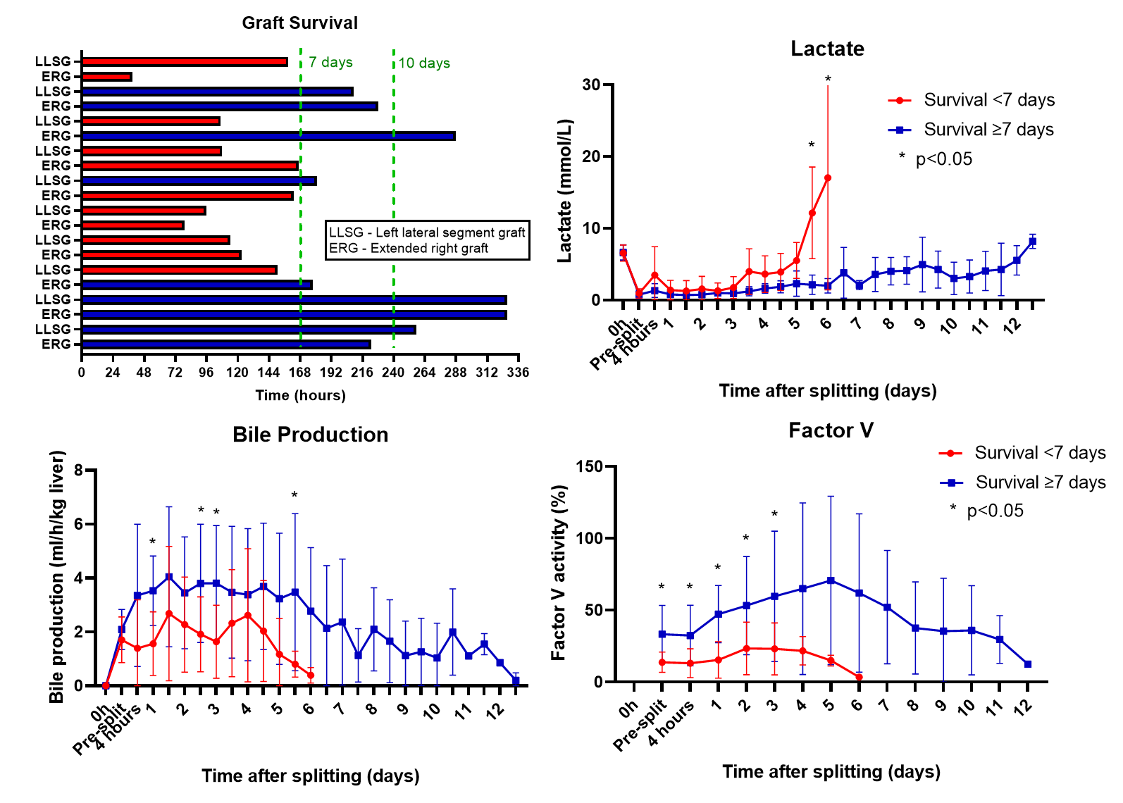 Results: Ten livers underwent a conventional split during normothermic perfusion resulting in 20 partial grafts. The median ex-vivo survival was 165 hours, and the longest survival was 328 hours (13 days) (Figure 2). Graft survival was demonstrated by lactate clearance, bile production and production of Factor-V in the long-term. A total of 9/20 (45%) grafts survived for ≥7 days. These grafts demonstrated a significantly higher bile production adjusted to graft weight and a significantly higher level of perfusate Factor-V in the first 48 hours of perfusion (Figure 2). All grafts eventually failed with a predictable and repeatable pattern which include: increasing vascular resistance, unresponsive hypoglycaemia, acidosis and growth of mixed flora microbial contaminants.