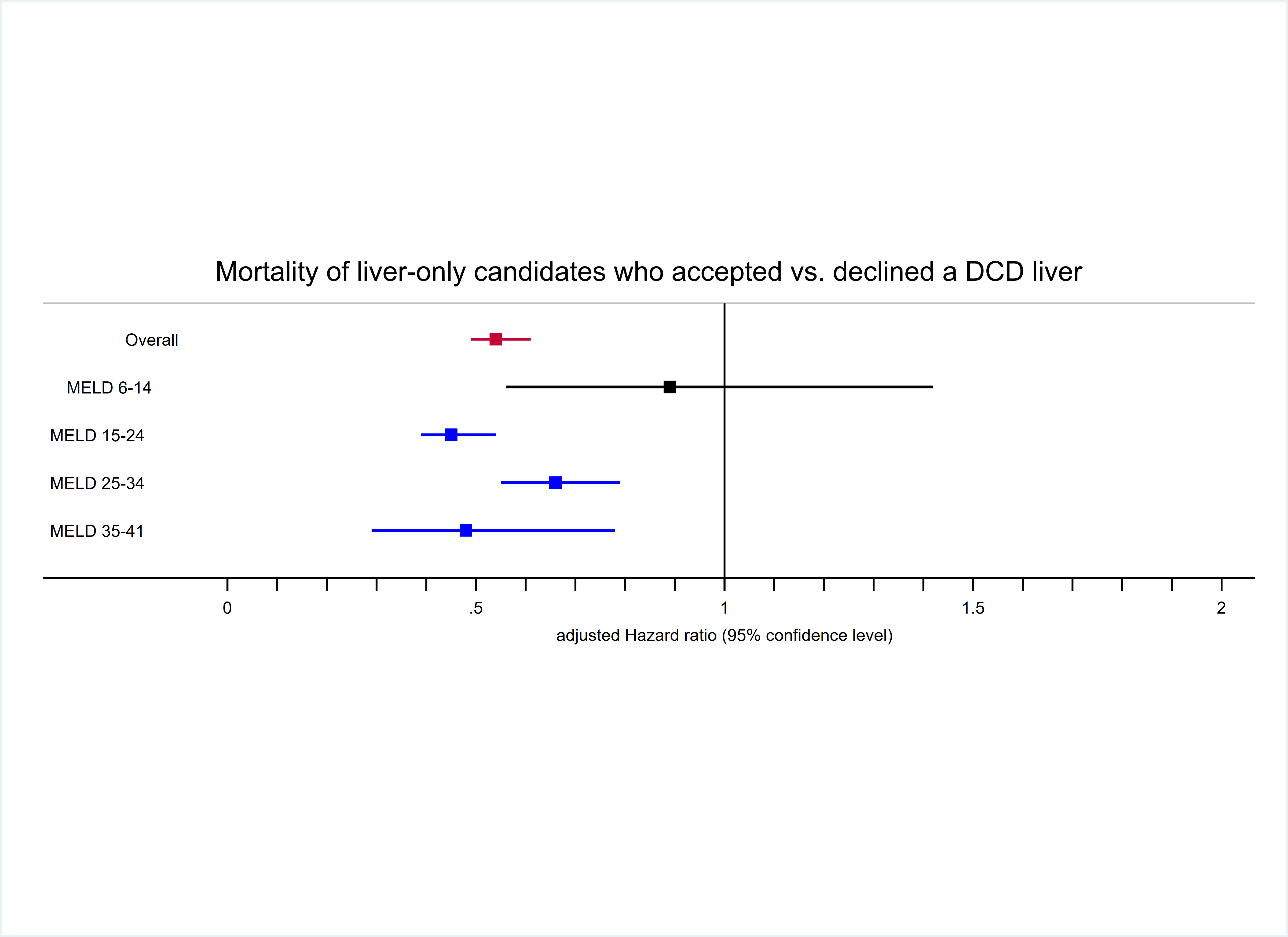 Results: Among DCD decliners, 50.9% died/dropped out from waitlist; only 43.1% were transplanted with a donation after brain death (DBD) liver. DCD acceptors had lower mortality compared to decliners at 10 years post-offer (35.4% vs. 48.9%, p<0.001) (Fiigure 1). After adjustment, DCD acceptors had 46% lower mortality risk compared to DCD decliners (aHR= 0.49 0.54 0.61). The survival benefit of DCD LT varied by MELD stratum. DCD acceptors and decliners with MELD 6-14 at offer had comparable risk of mortality (aHR= 0.56 0.89 1.42 , p=0.6 ). DCD offer acceptors had 55%, 34% and 52% lower risk of mortality compared to DCD offer decliners within MELD strata 15-24 (aHR= 0.39 0.45 0.54, p<0.001), 25-34 (aHR= 0.55 0.66 0.79 , p<0.001) and 35 or higher (aHR= 0.29 0.48 0.78 , p=0.004), respectively (Figure 2). Out of 1005 recovered DCD livers, 298 were discarded in 2019. If DCD livers were utilized at the same rate as comparable DBD livers, we estimated that 235 (78.9%) of them would have been transplanted.