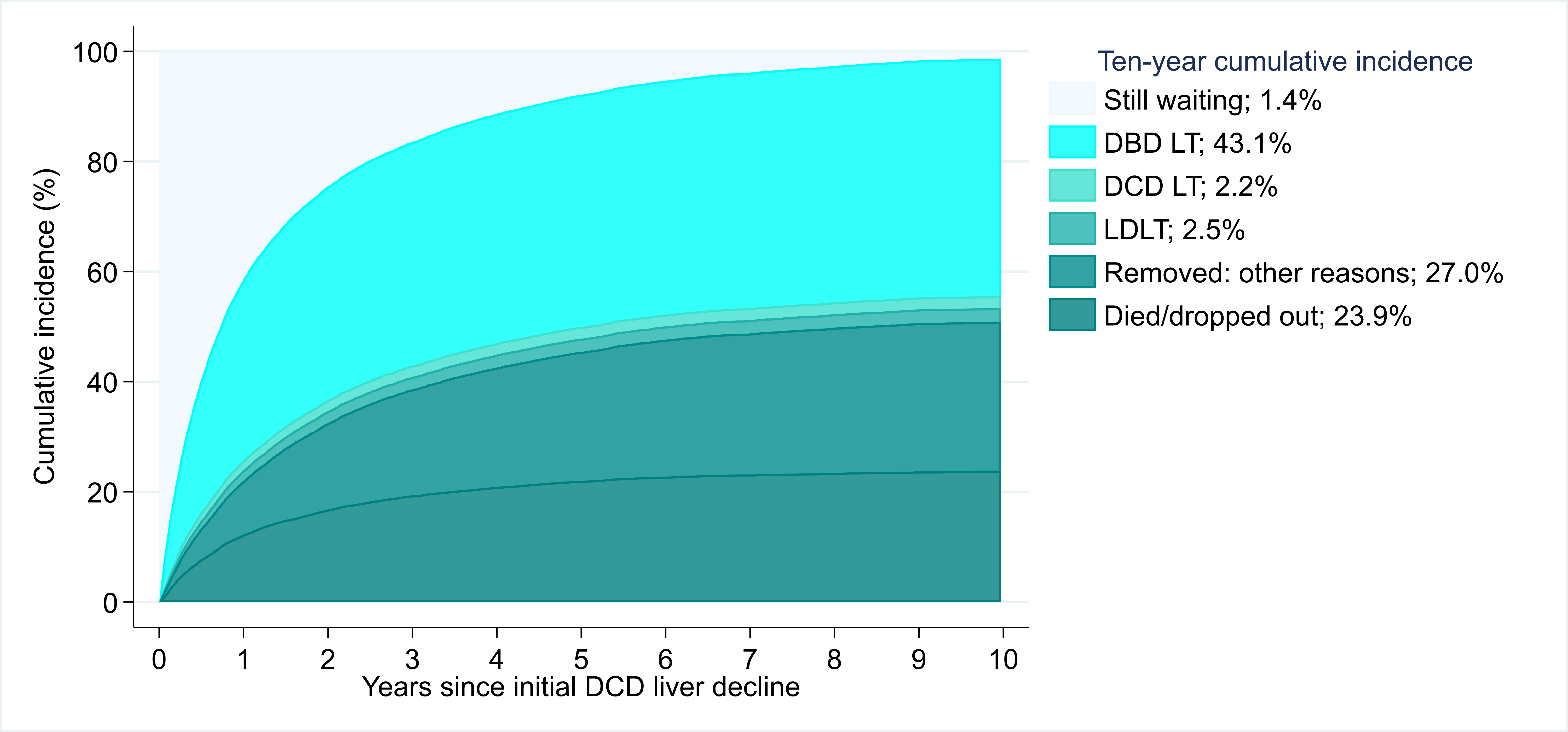 Conclusions: Despite risk of biliary complications, DCD offer acceptance is associated with considerable long-term survival benefit for liver transplant candidates. Increased utilization of DCD livers should be encouraged.