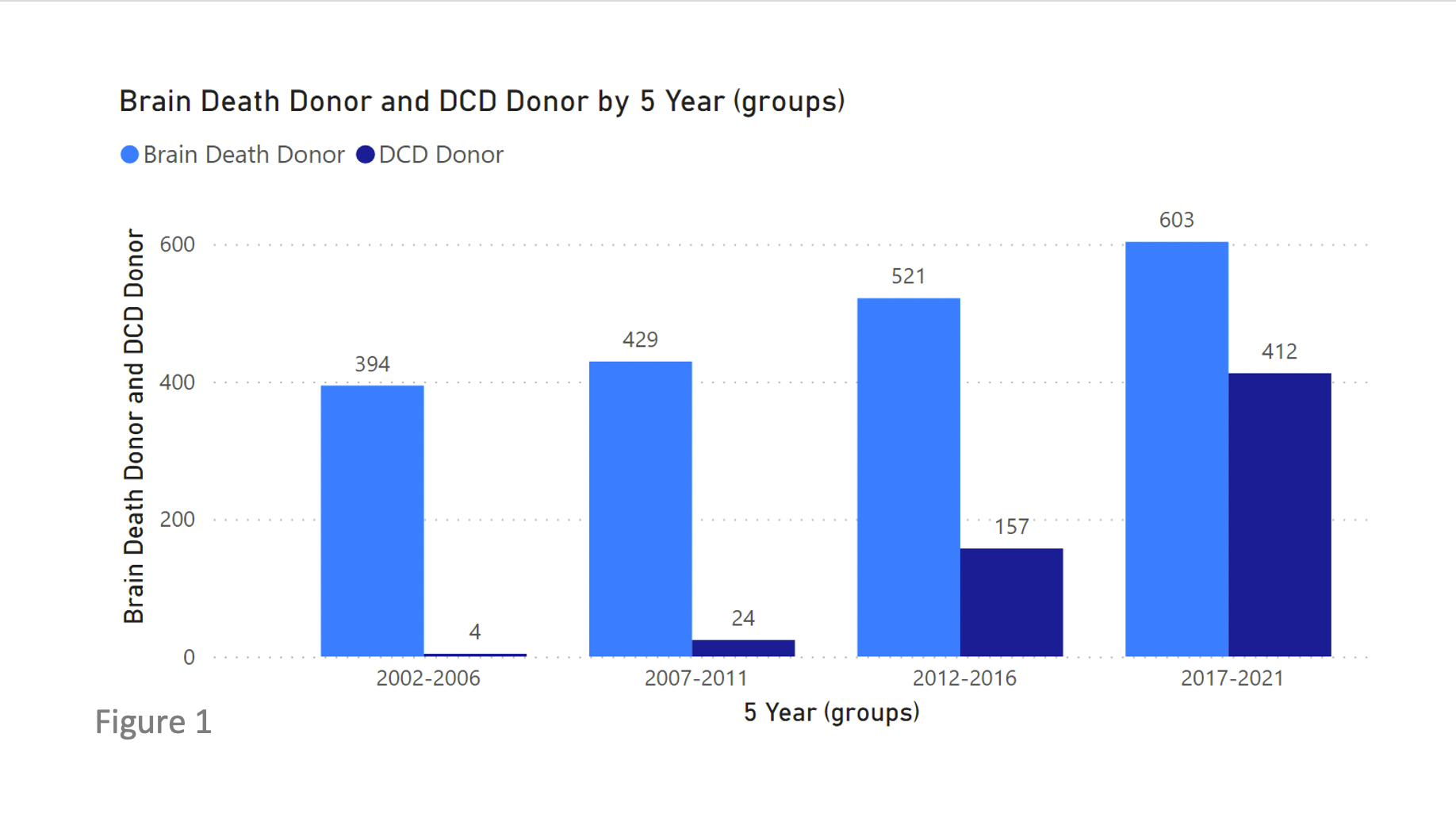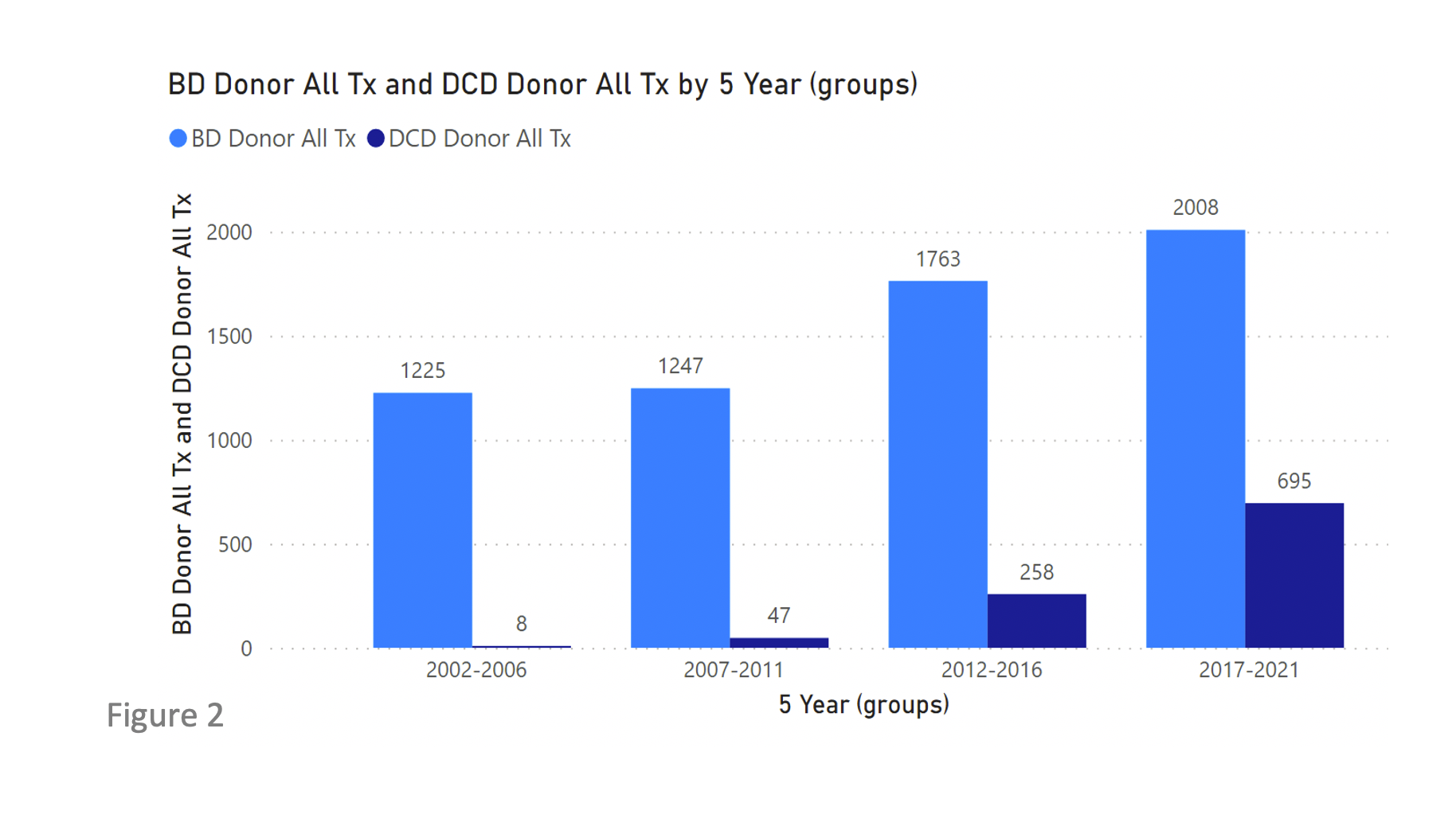 Results: Between 2002 and 2011, the OPO recovered 2,527 organs that were transplanted from 851 deceased donors. Of these 851 donors, 28 (3.3%) were DCD and 828 (96.7%) were donation after brain death (DBD). From 2012 through 2021, 4,724 organs were transplanted from 1,693 donors, increases of 86.9% and 98.9% respectively. DCD increased to 569 (33.6%) of donors, with 953 organs transplanted from DCD (20.2% of total). Comparatively, total U.S. donors with the OPO removed increased by 36.1% when these two decades are compared.[1]