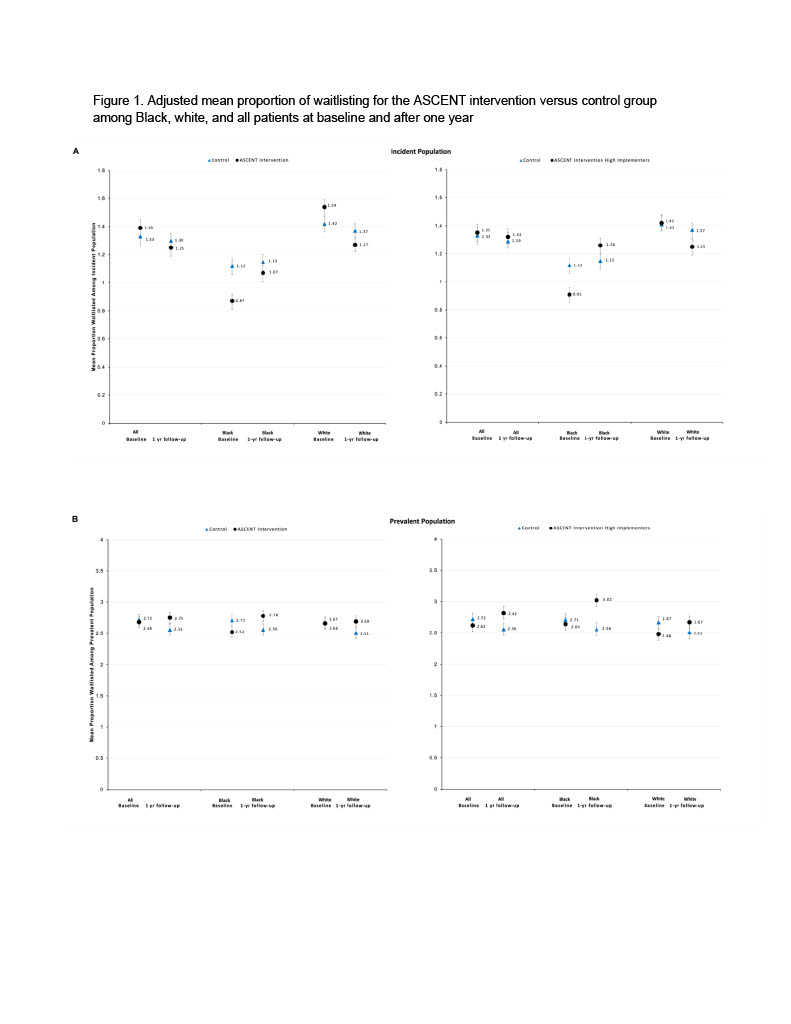 Results: Similar to national trends, the overall mean proportion of patients waitlisted in a facility declined 1 year after the intervention among incident patients (Figure, Panel A, left) in both the intervention vs. control facilities, and waitlisting was the same among prevalent patients (Figure 1, Panel B, left). However, the proportion of patients waitlisted declined for white ESKD patients in the intervention groups but increased for Black ESKD patients in both the incident (Figure 1, Panel A) and prevalent (Figure 1, Panel B) populations. Mean waitlisting significantly (p<0.05) increased among prevalent Black ESKD patients in the intervention group (baseline waitlisting: 2.52% (2.43, 2.61); follow-up: 2.78% (2.69, 2.87) while it declined among Black patients in the control group (baseline waitlisting: 2.71% (2.62, 2.80); follow-up: 2.56% (95% CI: 2.47, 2.65). In generalized linear models, overall differences in the mean proportion of patients waitlisted between intervention and control among Black patients at 12 months was 0.22% (0.02, 0.42), p<0.05. Among white patients, waitlisting declined in the control group and remained the same among intervention group facilities. Results were more pronounced among the 57% of intervention facilities considered high implementers (Figure 1, right).