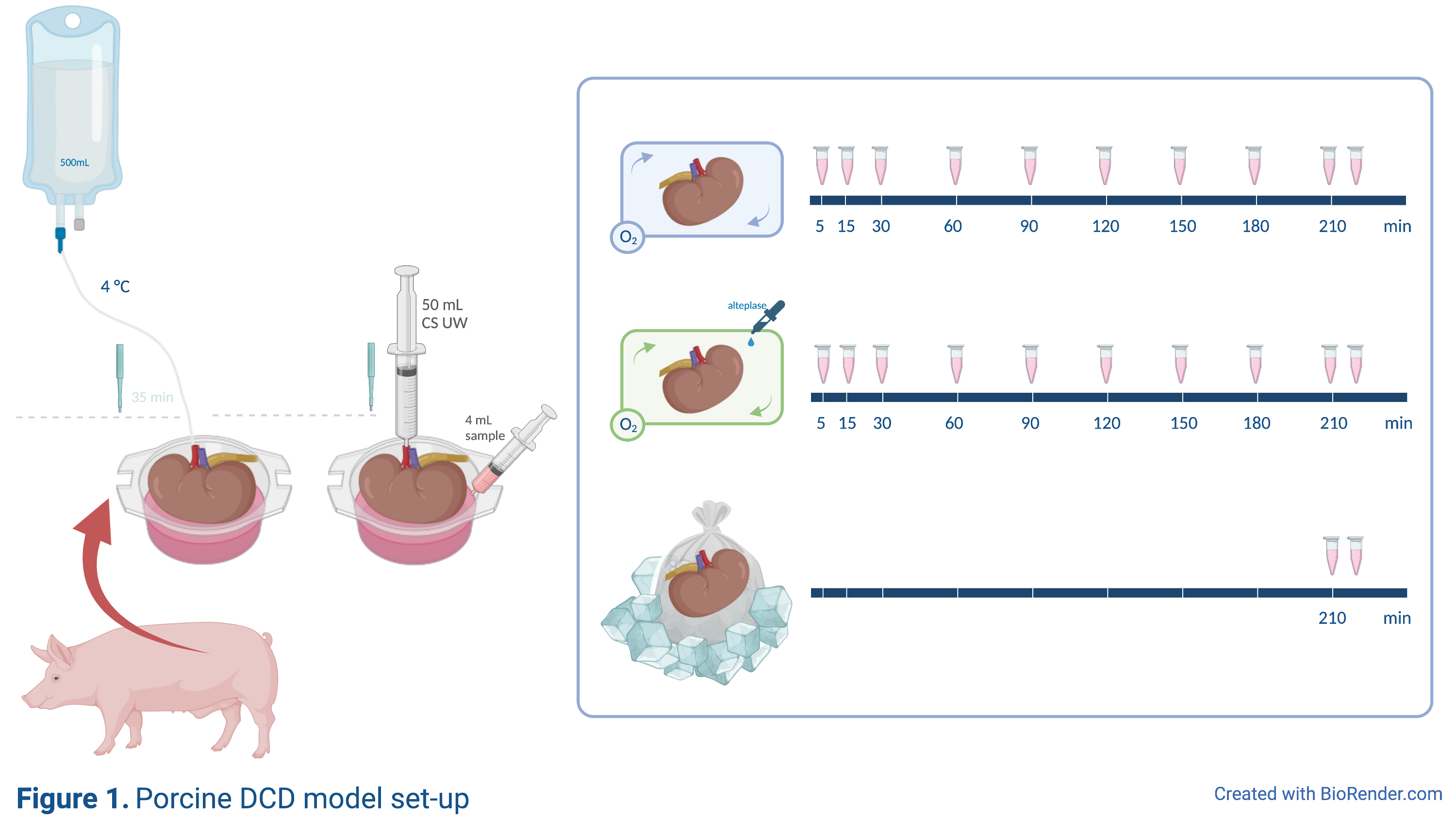 Viable porcine kidneys from an abattoir underwent 35 minutes of warm ischemia, were flushed with 500mL heparinized cold University of Wisconsin solution and subsequently preserved for 3.5 hours using either SCS, HMP, or HMP+alteplase (HMP+) (Figure 1). D-dimer, von Willebrand factor (VWF) and tissue-type plasminogen activator (tPA) levels were measured in perfusate samples at set times. The first and last perfusate sample prior to and after SCS/HMP was taken from a separate 50mL flush, directly from the renal vein. Kidney punch biopsies were immunohistochemically stained for an antibody against fibrin(ogen).