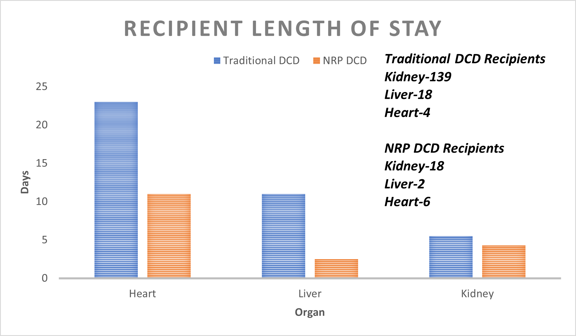 Results: Within our OPO, we define Warm Ischemic Time (WIT) as the start of the agonal phase (systolic BP < 80 mmHg or SpO2 < 80%) to NRP start.  Warm ischemic time in NRP DCD patients includes both the agonal phase and time to initiation of artificial regional perfusion (averaging 7 minutes). Recipients from a DCD donor in which NRP was utilized had an average length of stay (LOS) of 6 days versus 13 days for traditional DCD. Compared to traditional DCD heart recoveries (average LOS 23 days with one patient expiring 42 days post-transplant), the NRP average length of stay was 11 days. NRP donors had a lower average age (33) to traditional DCD donors (49).  Additionally, within the NRP DCD population, we saw a higher number of organs transplanted per donor (OTPD) by almost 1 organ with NRP DCD at 2.71 OTPD and traditional DCD at 1.88 OTPD. This is in spite of an increase in average WIT by 11 minutes for NRP donors.