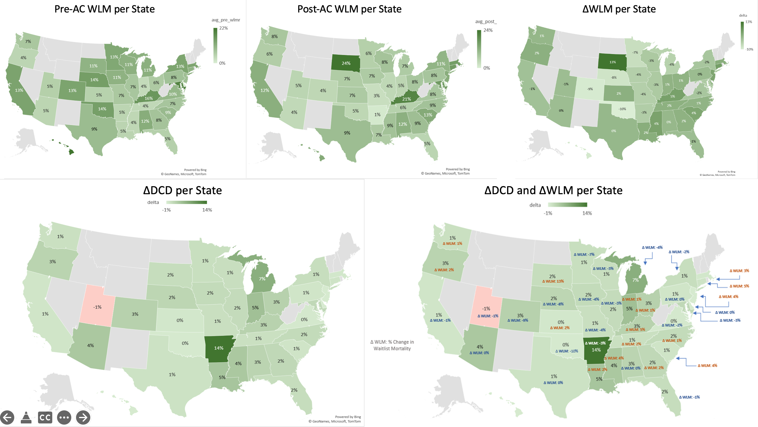 Method: Study period: 01/2016- 08/2021. Waitlist and transplant datasets were retrieved from the Scientific Registry of Transplant Recipients. All adult DCD LTs were included. The cohort was dichotomized into pre-AC (01/2016-02/2020) and post-AC eras (02/2020-08/2021). Annual state-based DCD LT rates were calculated as a function of waitlist size (the number of DCD LTs/ waitlisted patients/year), and waitlist mortality (WLM) was calculated as the number of waitlist removals due to death over the number of patients on the waitlist per State/ year. State-based differences (Δ) in DCD rate (ΔDCD) and WLM rate (ΔWLM) were measured pre- and post-AC.