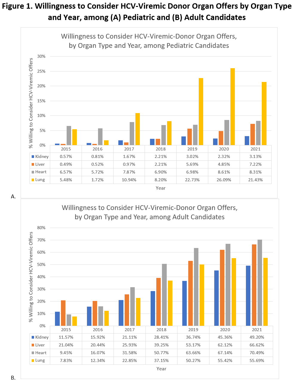 Conclusion: Willingness to consider HCV-viremic donor organs has increased since 2015 at the patient and center levels among pediatric and adult candidates, especially pediatric lung transplant candidates. This reflects the increasing recognition of the safety and efficacy of HCV-viremic organ transplants into HCV-seronegative recipients. However, a substantial percentage of transplant centers still have no candidates listed as willing to consider HCV-viremic donor offers, possibly indicating a lack of comfort with HCV D+/R- transplants. We must address this discomfort with educational initiatives to ensure this valuable organ pool is available to as many waitlist candidates as possible.