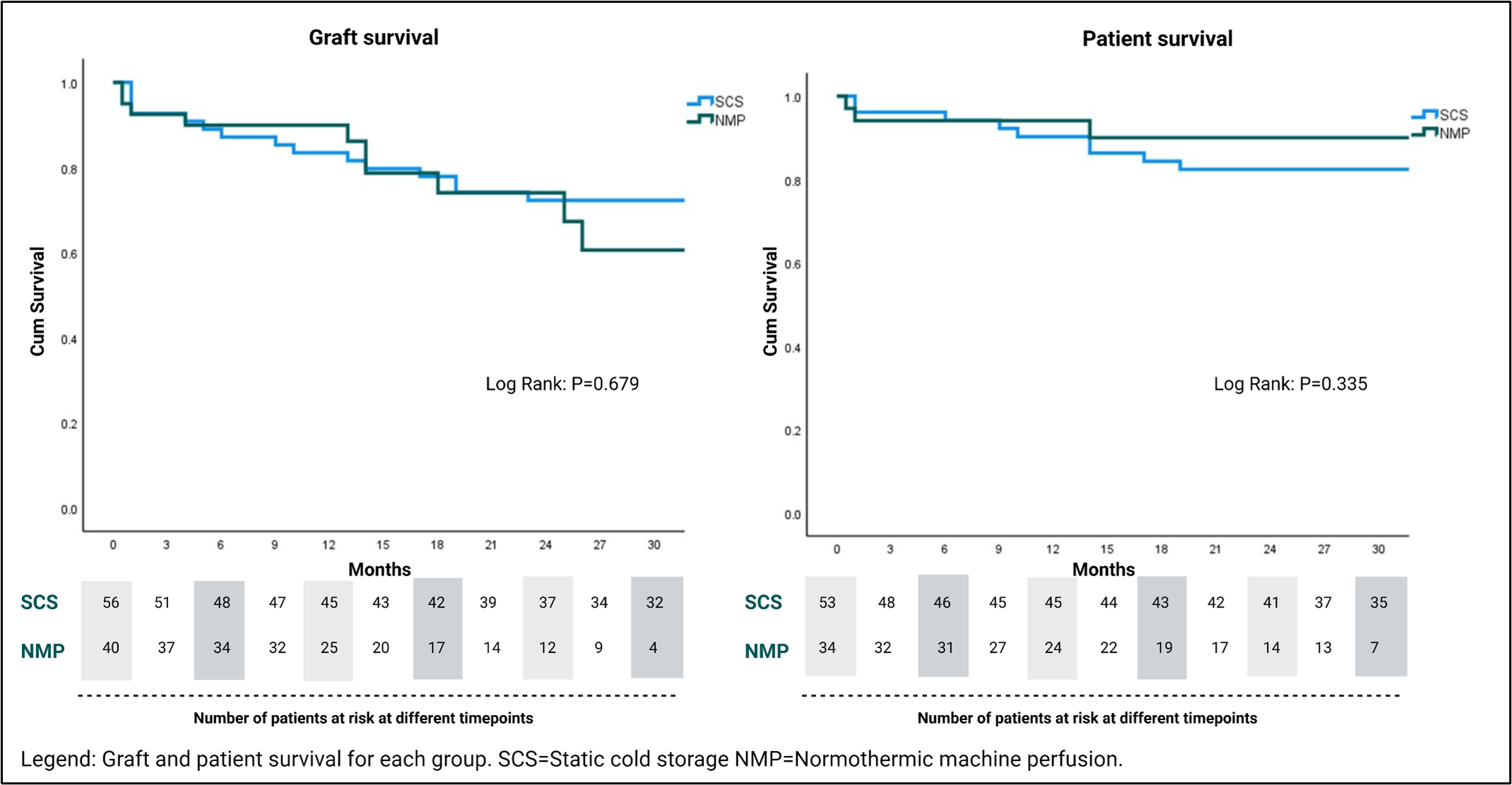 Results: During the study period, 37 patients underwent retransplantation with a NMP preserved graft. Three of these received two NMP preserved grafts. The CS control group comprised 54 patients, and two of these patients received two CS grafts. Therefore, the NMP and CS groups comprised 40 and 56 grafts respectively. Donor, graft, operative and outcome variables are displayed in table 1. The 6-month graft (90% v 86%. P=0.59) and patient (94% vs 93%, P=0.79) survival did not differ between groups (Table 1). This was despite the NMP group having significantly more steatotic grafts (Moderate steatosis; 30% vs 4%, P=<0.01), donors with transaminases >1000 IU/L (0% v 23%, P=<0.01), and grafts previously declined by at least one other transplant centre (78% v 26%, P=<0.01) (Table 1). The peak alanine transaminase in the initial post-operative 7 days was significantly lower (521 vs 796, P=0.02) in the NMP group, however the rate of early acute rejection was higher (50% vs 27%, P=0.02) but did not impact graft survival. Significantly higher rates of CVVH in the NMP group did not translate to a longer length of stay in ICU. Furthermore, longer term graft and patient survival did not differ between groups (Figure 1).