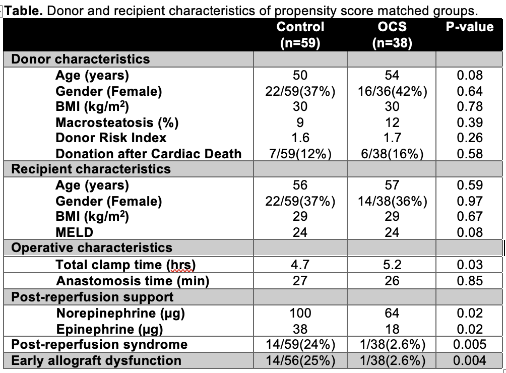 Method: This was a retrospective, single center, case-control study. All transplants utilizing OCS Liver between 1/1/2018 and 12/31/2020 were compared with a propensity score matched (PSM) cohort . The control population was matched for age, MELD, donor type and ventilator/circulatory support. Multiorgan transplants were excluded from the analysis. Donor, procurement, and recipient characteristics were collected for all recipients. Anesthesia records containing vitals by minute and pressor/inotropes were collected to establish baseline (5 minutes prior to reperfusion) and up to 30 minutes post-reperfusion hemodynamics.