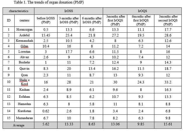 Methods: Totally, 15 donation centers which among 56 country’s centers had a low donation rate were selected and went through IrOSS course. After the training, the IrOQS program was performed seasonally in each center. At each stage of this program, family’s consent rate, donor maintenance, case selection, case detection and brain dead confirmation were evaluated. The weaknesses of the centers were analyzed using the available statistical data. According to the results, solutions were provided and short-term goal-oriented training was also provided. In this study, the PMP of each center before, 3 and 6 months after the IrOSS course and 3 and 6 months after the first stage of IrOQS program and also 3 months after the second stage was calculated and the impact was analyzed.