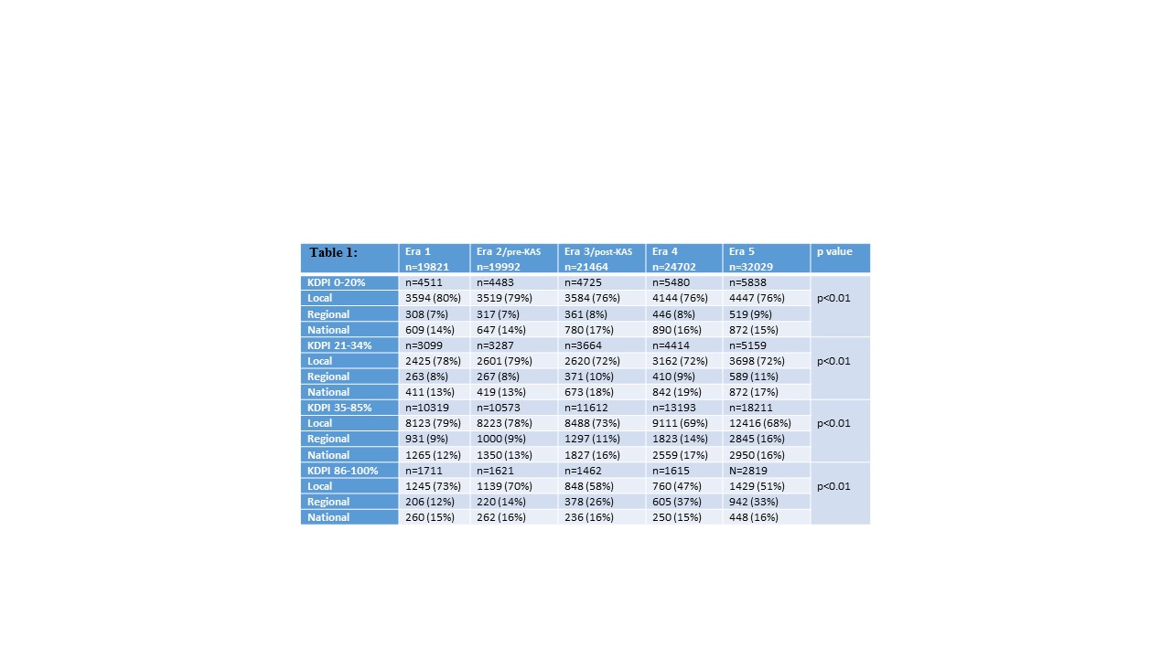 Methods: Using UNOS data, we compared local, regional, and national utilization for deceased donor kidney transplants (DDKT) alone according to KDPI group and KAS era: Era 1 (2010-2011, pre-KDPI), Era 2 (2012-2013, pre-KAS), Era 3 (2014-2015, early post-KAS), Era 4 (2016-2017), and Era 5 (2018-2020).