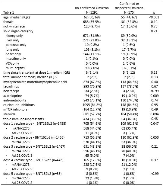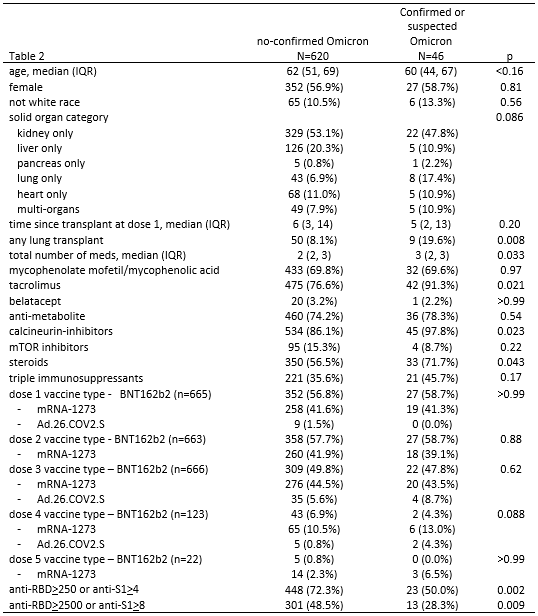Conclusion: Test-confirmed COVID-19 infections were reported in 5.7% of vaccinated SOTRs during the Omicron wave. COVID-19 infection appeared correlated with lower pre-Omicron wave antibody levels. These findings highlight the importance of layered prevention strategies for the immunocompromised including social distancing, masking, vaccination and passive immunity strategies.