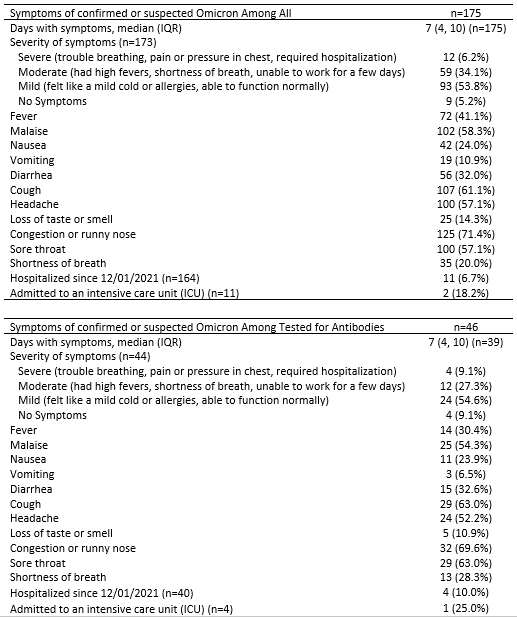 Results: 1467/1801 eligible SOTRs responded to the survey (81.6%) and 666 underwent serologic testing. 175/1467(12%) reported suspected or test-confirmed COVID-19 infection during the Omicron wave; 150/175(86%) reported having a positive PCR or home COVID-19 test (Omicron-confirmed). SOTRs who were Omicron-confirmed were younger (median [IQR] 55 [44-67] vs. 62 [50-68], p<0.001) and more likely to be using azathioprine (11% vs. 6%, p=0.009) (Table 1). Regarding illness severity, 11/164(7%) reported hospital admission for COVID-19, 59/173(34%) reported high-fevers or dyspnea, 93/173(54%) reported mild cold-like symptoms, and 9(5%) were asymptomatic. Symptoms included nasal congestion(71%), cough(61%), malaise(58%), headache(57%) and sore throat(57%)(Table 3A). Two SOTRs died during the study period; family remembers reported that these deaths were secondary to COVID-19 infection. Among the 666 SOTRs who underwent serologic testing, 46/666(7%) were Omicron-suspected or confirmed; 37/46(80%)tested positive via PCR or home test. The 46 Omicron-suspected or confirmed were more likely to be lung transplant recipients(20% vs. 8%, p=0.008), with greater number of immunosuppression medications(median, [IQR] 3 [2-3] vs. 2 [2-3], p=0.03), including tacrolimus(91% vs. 77%, p=0.02), steroids(72% vs.57%, 0.04), and calcineurin inhibitors(98% vs. 86%, p=0.02). 39/46 reported symptom duration of median (IQR) 7(4-10) days, 4/40 reported hospital admission, and 1/4 to an intensive care unit (Table 3B). 37/46(80%) of Omicron-suspected or confirmed and 534/620 (86%) of no-Omicron (p=0.3) were positive for anti-spike antibodies before the Omicron wave. 50% of Omicron-suspected or confirmed and 72% of no-Omicron SOTRs had anti-RBD anti-RBD>250 U/mL or anti-S1>4 AU (p=0.002)(Table 2).