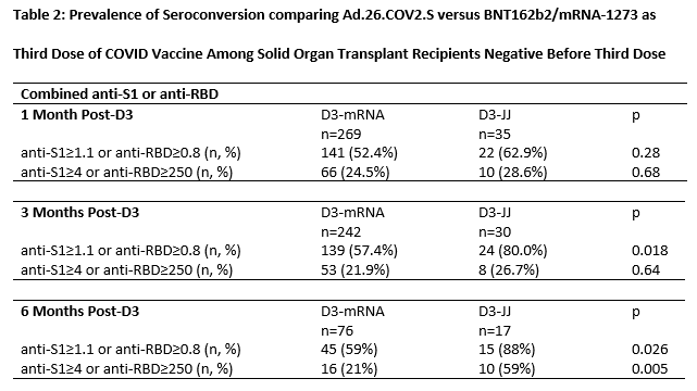 Conclusion: Heterologous vaccination with Ad.26.COV2.S for D3 was associated with higher late seroconversion than homologous vaccination with a third mRNA dose among SOTRs negative after a 2-dose mRNA series. SOTRs with persistent negative sero-response to mRNA vaccine series might benefit from Ad.26.COV2.S as an additional vaccine dose.