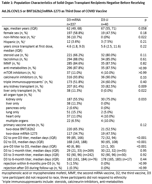 Results: 40 D3-JJ recipients and 337 D3-mRNA recipients were similar in sex, years since transplant, and mycophenolate use. At 1-month post-D3, 63% of D3-JJ recipients and 52% of D3-mRNA recipients became seropositive (p=0.28); this difference did not reach statistical significance in weighted analysis (weighted incidence-rate-ratio wIRR=0.981.291.69, p=0.064). High-titer response at 1-month post-D3 occurred in 29% of D3-JJ recipients and 25% of D3-mRNA recipients (p=0.7); this difference did not reach statistical significance in weighted analysis (wIRR=0.911.572.70, p=0.10). At 3-months post-D3, 80% of D3-JJ recipients and 57% of D3-mRNA recipients were seropositive (p=0.018); D3-JJ recipients were 1.4-fold more likely to be seropositive (wIRR=1.101.401.77, p0.006). High-titer response at 3-months post-D3 occurred in 27% of D3-JJ recipients and 22% of D3-mRNA recipients (p=0.64); this did not reach statistical significance (wIRR=0.440.921.93, p=0.8). At 6-months post-D3, 88% of D3-JJ recipients and 59% of D3-mRNA recipients were seropositive (p=0.026); D3-JJ recipients were 1.41-fold more likely to be seropositive (wIRR=1.041.411.93, p=0.029). High-titer response at 6-months post-D3 occurred in 59% of D3-JJ recipients and 21% of D3-mRNA recipients (p=0.005); D3-JJ recipients were 2.63-fold more likely to develop high-titers at 6-months post-D3 compared to D3-mRNA recipients (wIRR=1.382.635.00, p=0.003). Severe adverse reactions after D3 were rare; one D3-mRNA recipient reported fluid overload temporarily associated mRNA-1273. No D3-JJ recipients reported rejection before or after D3. Six D3-mRNA recipients reported acute rejection at median (IQR) 23 (12-131) days before D3.