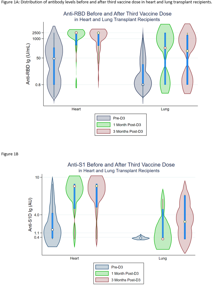 Results: HT and LT recipients were similar with respect to age, sex, and time since transplant (Table). More LT recipients reported triple-immunosuppression (14% vs 71%, p<0.001). Before D3, 35/111(32%) of HT vs 42/75(56%) of LT recipients were negative for anti-spike antibodies. By 1 month post-D3, 24/35(69%) HT and 15/42(36%) LT recipients seroconverted (negative to positive antibody). This was approximately stable at 3 months post D3; 24/35(69%) HT vs 16/39(41%) LT recipients. HT recipients had higher median anti-RBD and anti-S1 antibodies before D3, 1 month, and 3 months post-D3 on both assays at all timepoints (Figure 1A, 1B).