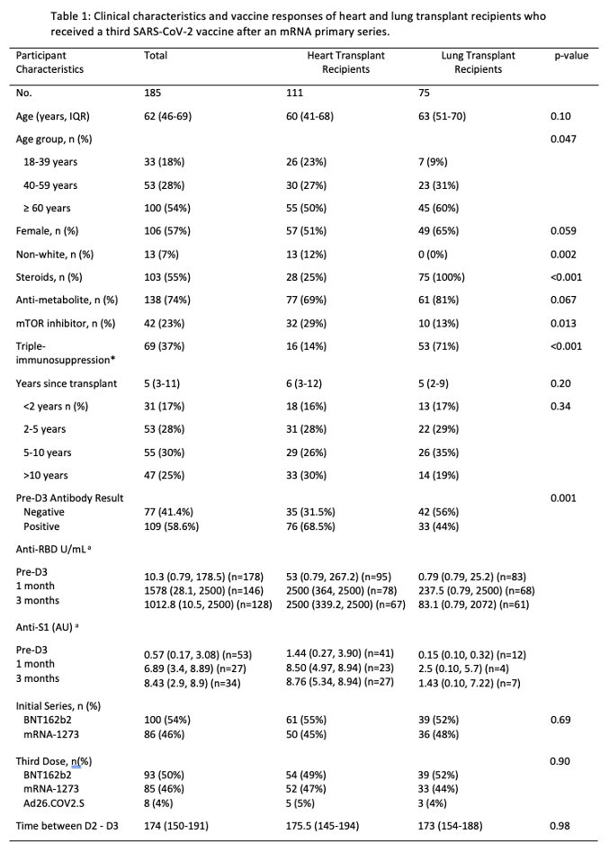Methods: A total of 111 HT and 75 LT recipients without prior SARS-CoV-2 infection underwent anti-spike antibody testing with two clinical assays (Roche Elecsys anti-receptor binding domain (RBD) Ig [anti-RBD] and/or Euroimmun Ig [anti-S1] before, 1-, and 3-months after receiving D3 (BNT162b2, mRNA-1273, or Ad26.COV2.S). Population factors and antibody responses were compared using Fisher’s exact testing for categorical variables and Wilcoxon rank-sum testing for continuous variables.