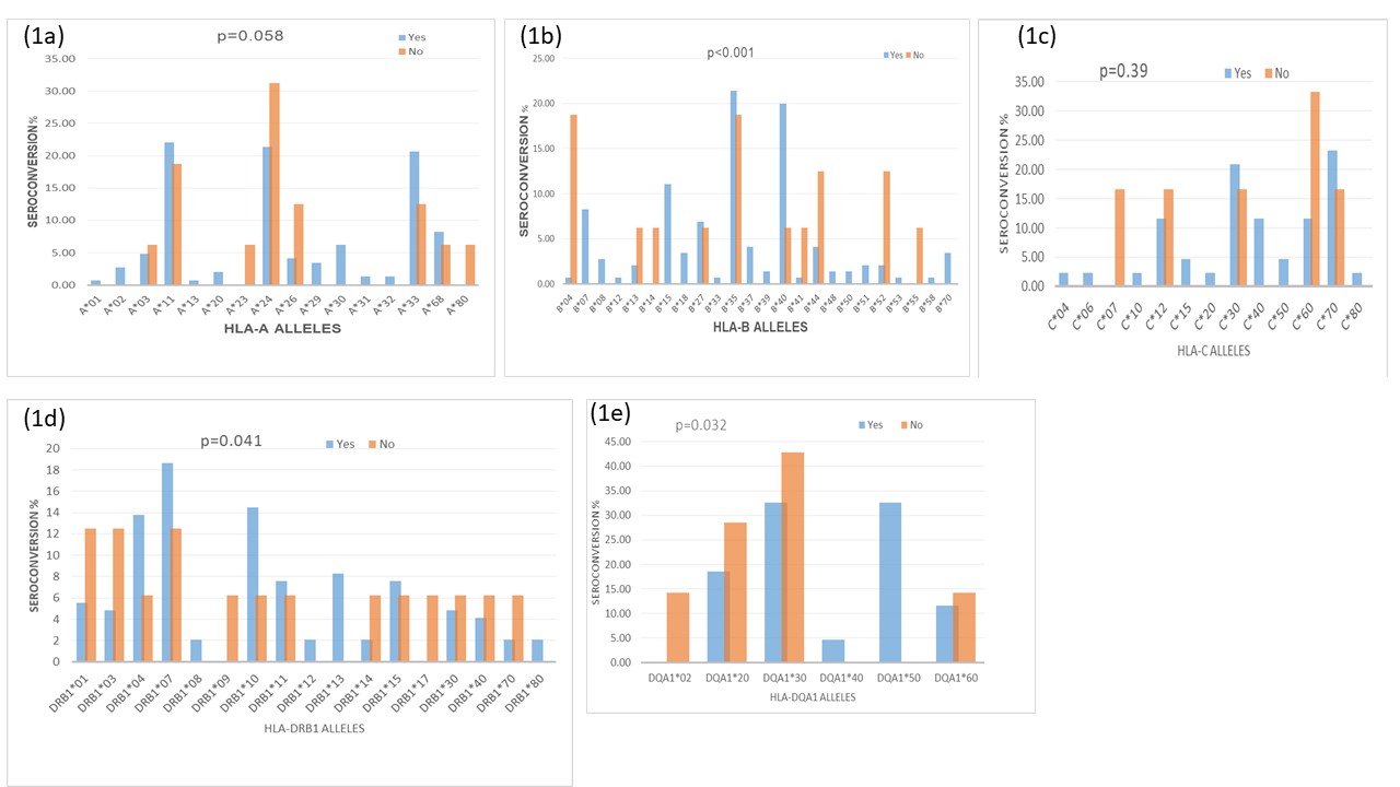 Conclusion: Renal transplant recipients with SARS-CoV-2 infection developed a robust seroconversion rate of 90.0% and different alleles of HLA-B, DRB1 and DQA1 were significantly associated with the seroconversion.